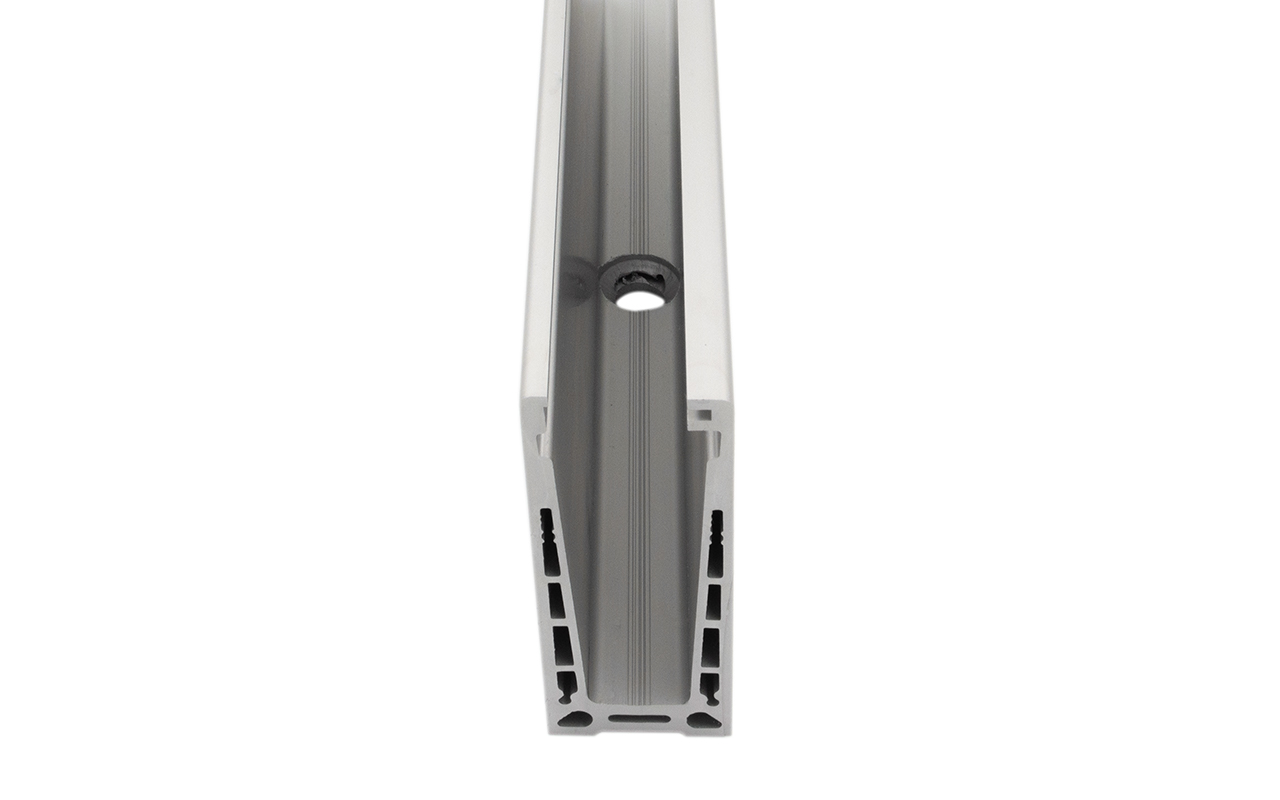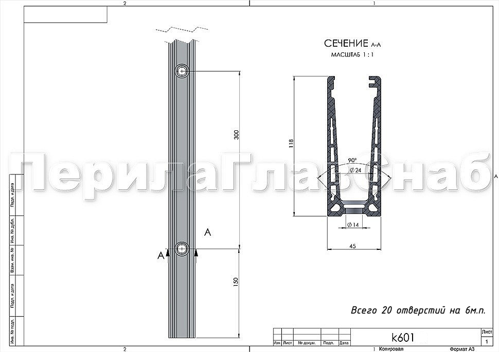 k601 — профиль для ограждений на несущем стекле (для стеклянных ограждений). Алюминиевый профиль чаще всего используется при строительстве таких объектов, как торговые дома, бизнес-центры, отели, спортивные сооружения. Максимально допустимая высота ограждения может доходить до 1200 мм, боковая нагрузка – до 430 кг. В данной модификации профиля предусмотрены крепежные отверстия. Наличие крепежных отверстий гарантирует более удобную и быструю установку профиля на объекте.