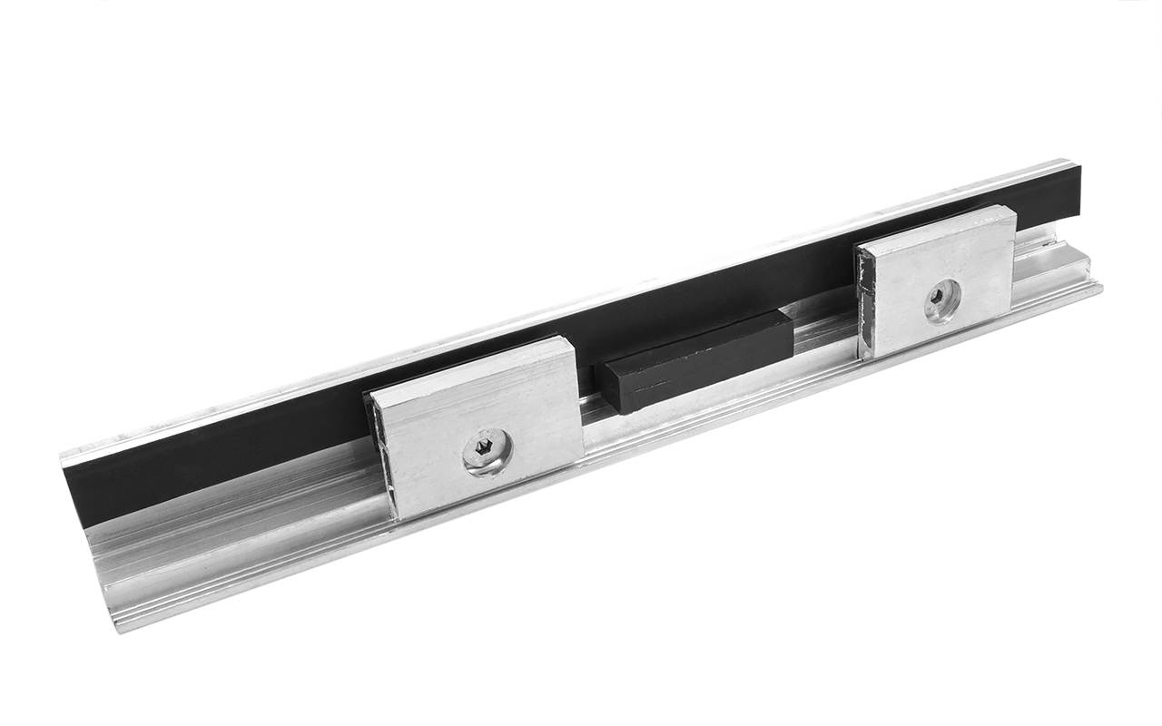 Вставить Гайку М6 (идет в комплекте) в паз базового элемента. Винт М6 вставить в прижимной элемент и соединить прижим с базовым элементом, не затягивая его
