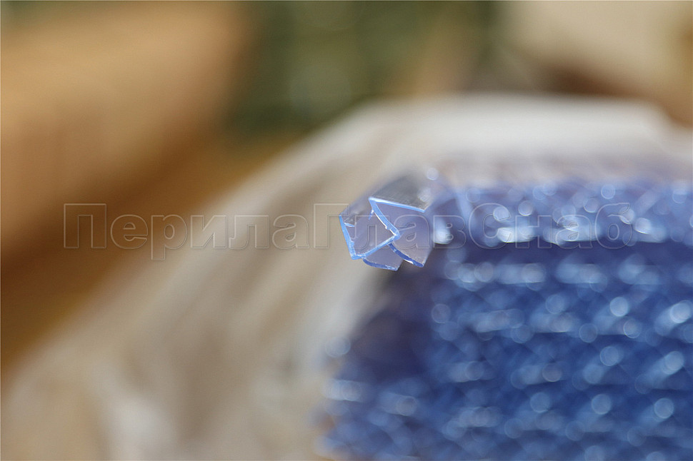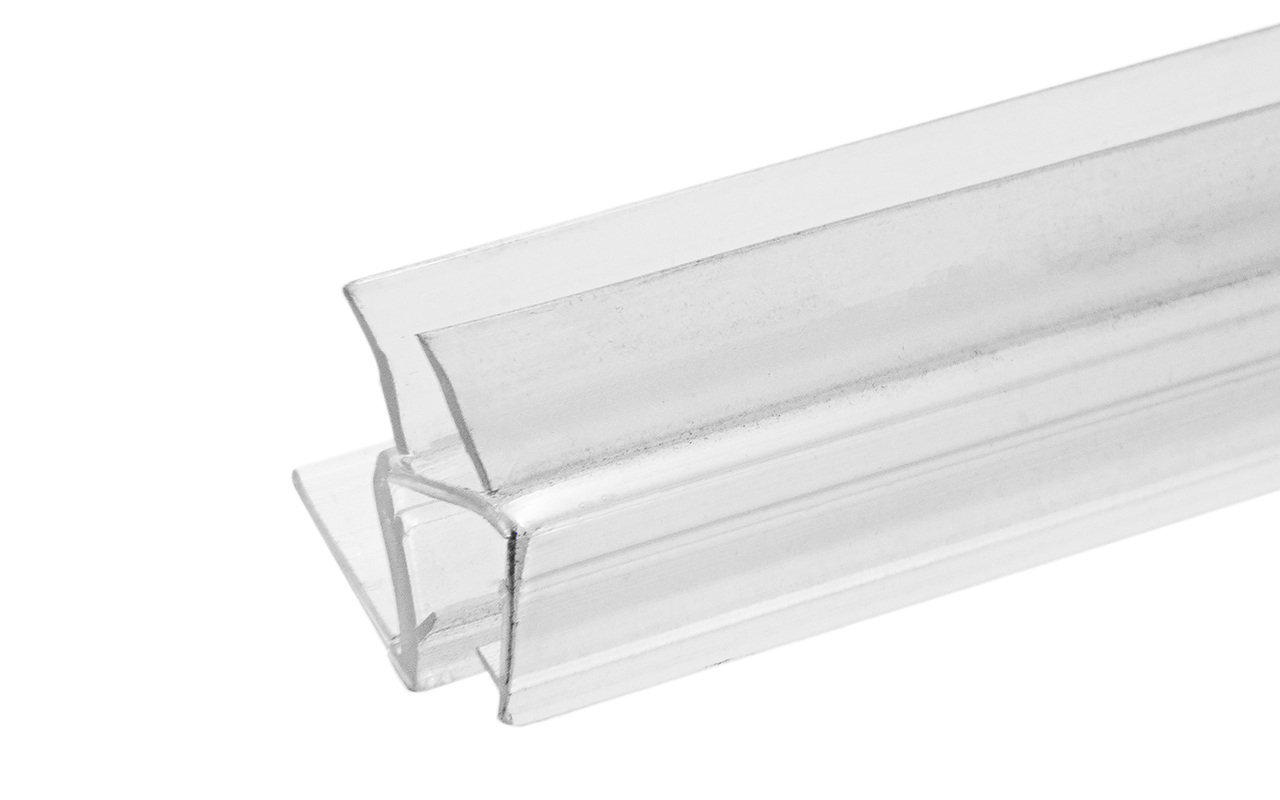 Уплотнитель имеет исполнение прозрачной поверхности, выполнен из материала ПВХ. Имеет П-образный профиль. Толщина одного типоразмера составляет 1.5 мм, длина – 2200 мм. За счет своих свойств (стойкость к щелочам, минеральным маслам и многим кислотам) прекрасно подходит для крепления стеклянного листа по всему периметру. Позволяет герметично соединять стеклянные панели со стеной, что гарантируют отсутствие течи в вертикальной части конструкции. Этот уплотнитель применим в сочетании со стеклом толщиной до 8 мм и углом в плане до 1350. Лучше всего подходит для установки в пол.