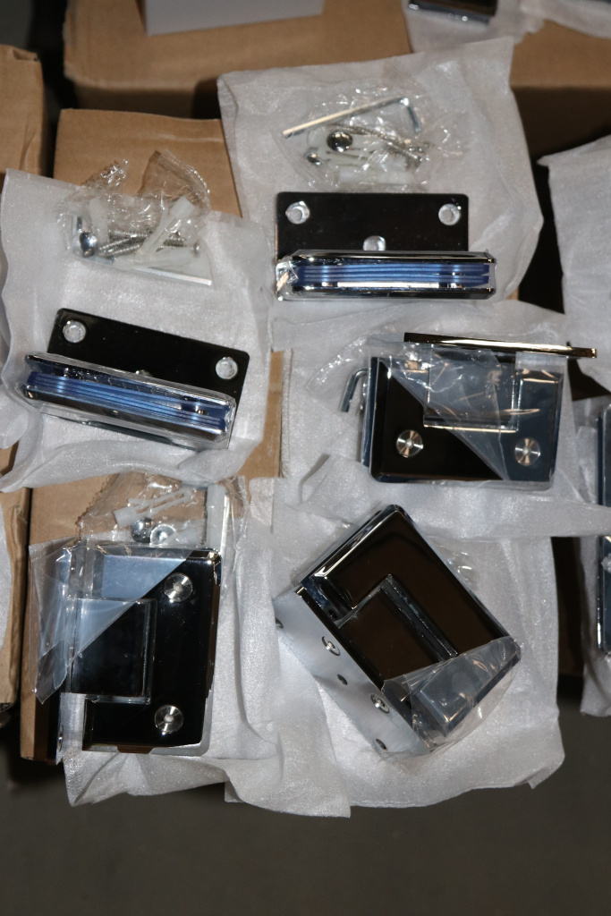 Петля из латуни с полированной поверхностью из хрома предназначена для стыковки между собой конструкционных элементов из стекла, толщина которых находится в диапазоне от 8 до 10 мм. Имеет фланец, со смещением, который при монтаже направляется в сторону душа, в результате чего становится не виден с внешней стороны. Также используется для крепления стеклянной двери к краю стены, продолжая её тем самым визуально. В ней реализована функция самозакрытия и поворота в обе стороны. Петля стекло-стекло крепится с обеих сторон на стеклянные поверхности, плотно прижимаясь к ним своими металлическими зажимами. Максимальный вес двери на 2 петли составляет 45 кг. Имеет функцию доводчика до закрытия от 25°. Максимальный угол разведения стыковочных элементов в плане составляет 90°. Крепление предусмотрено на 5 винтов. Размер одной стороны петли составляет 90х55 мм.