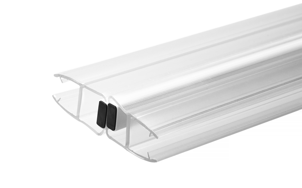Комплект из двух профилей с магнитом. Монтируется по всему периметру стеклянного листа. Позволяет герметично соединять стеклянные панели между собой благодаря встроенному магниту. Толщина одного типоразмера составляет 1.5 мм, длина – 2200 мм. За счет своих свойств (стойкость к щелочам, минеральным маслам и многим кислотам) прекрасно подходит для крепления стеклянного листа по всему периметру. Применение этого комплекта гарантирует отсутствие течи в вертикальной части конструкции. Уплотнитель из комплекта применим в сочетании со стеклом толщиной до 8 мм и углом в плане до 180.