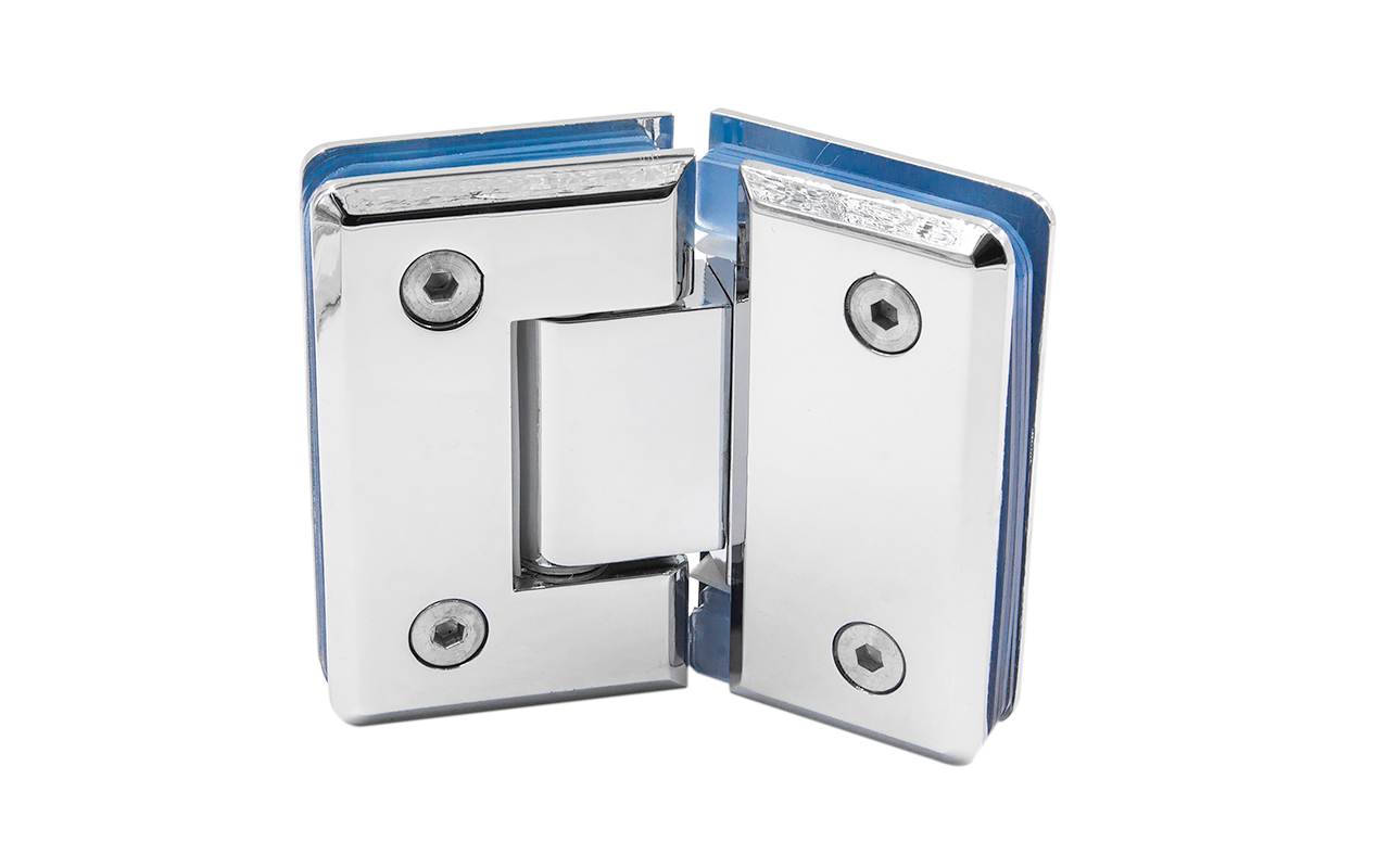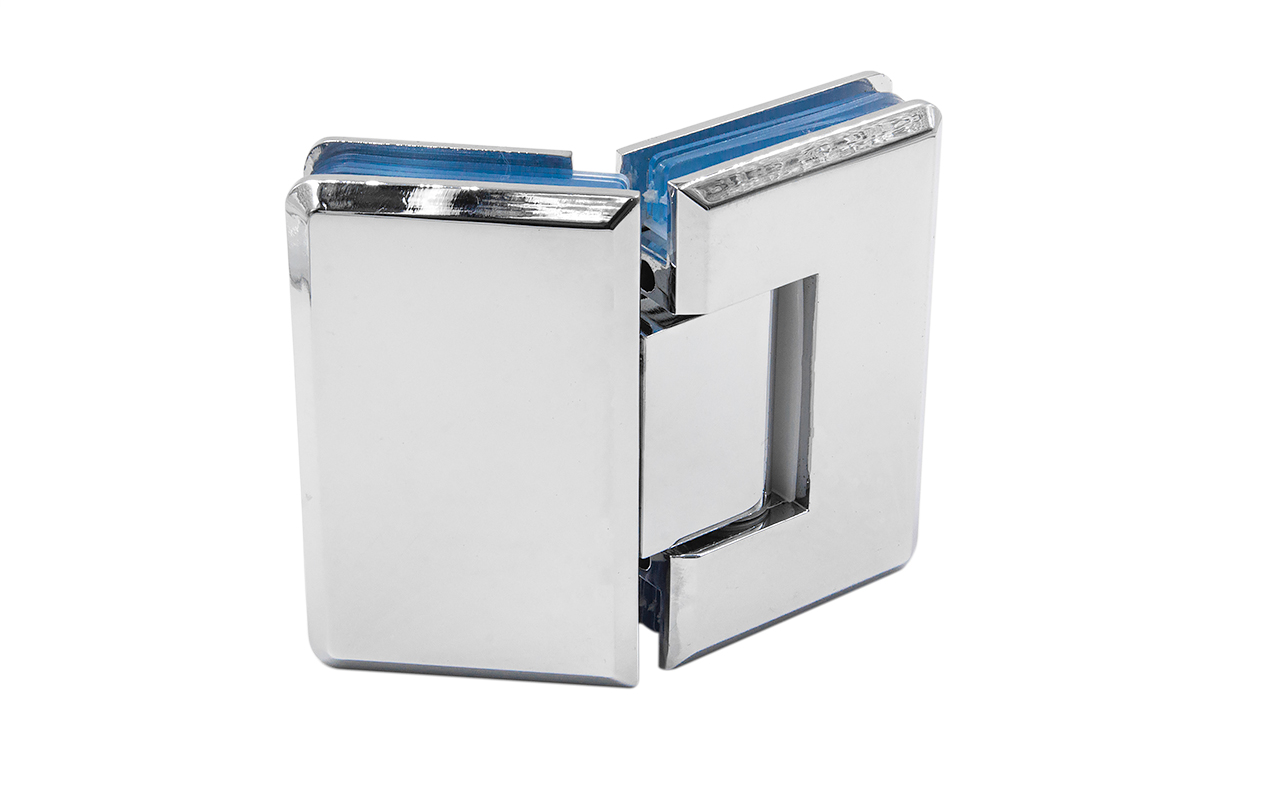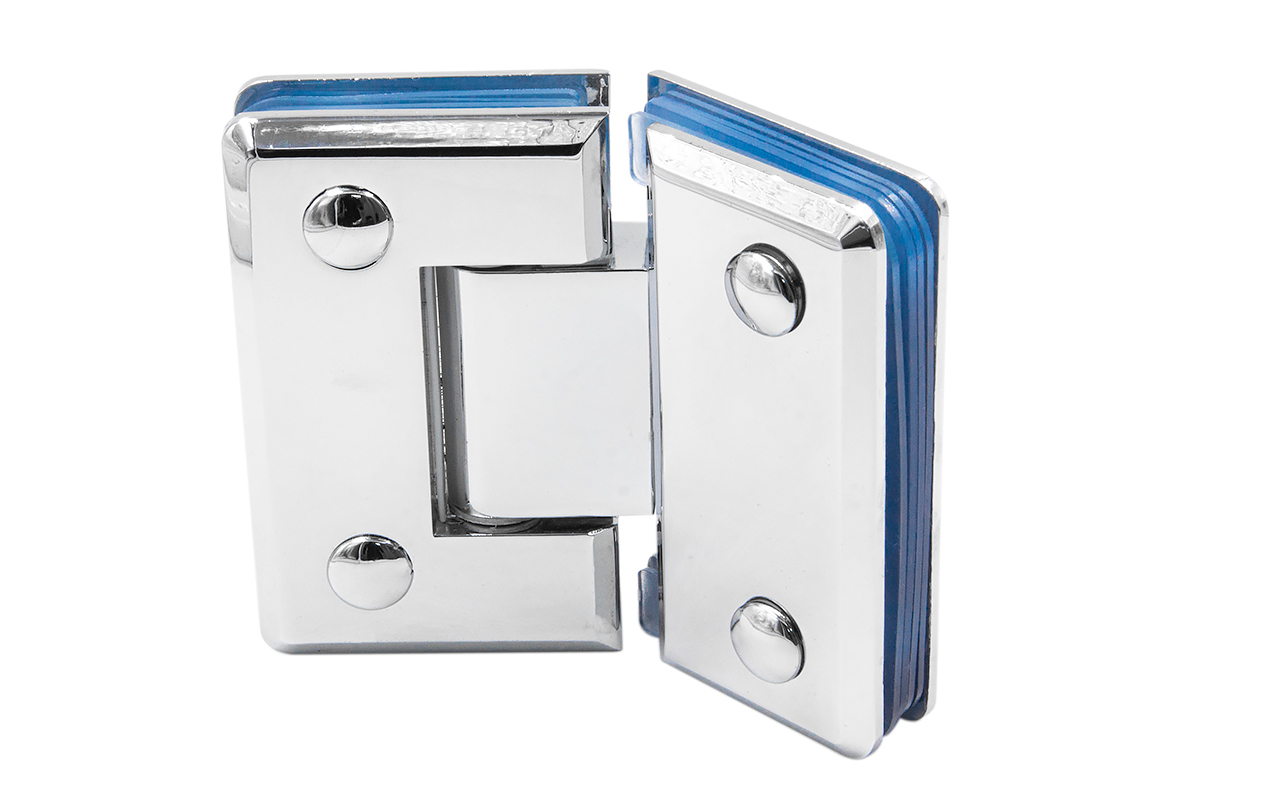 Петля из латуни с полированной поверхностью из хрома предназначена для стыковки между собой конструкционных элементов из стекла, толщина которых находится в диапазоне от 8 до 10 мм. В ней реализована функция самозакрытия и поворота в обе стороны. Петля стекло-стекло крепится с обеих сторон на стеклянные поверхности, плотно прижимаясь к ним своими металлическими зажимами.