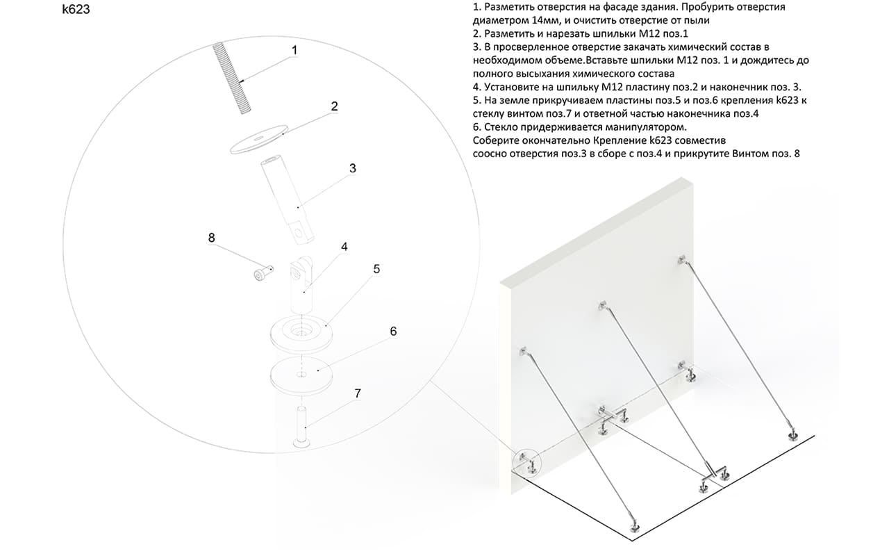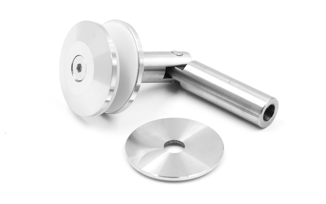 предназначен для крепления стекла к стене путем монтажа детали на шпильку М12 в стену и последующим креплением стекла от 10 до 20мм.