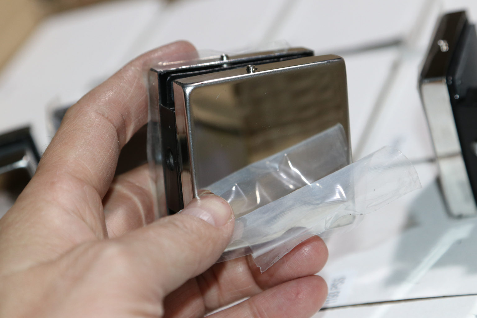 Коннектор разбирается на две половинки, Г-образной стороной крепится к стене на саморезы. Затем к нему прикладывается стекло со специальными полукруглыми вырезами, а далее второй половинкой стекло зажимается.
