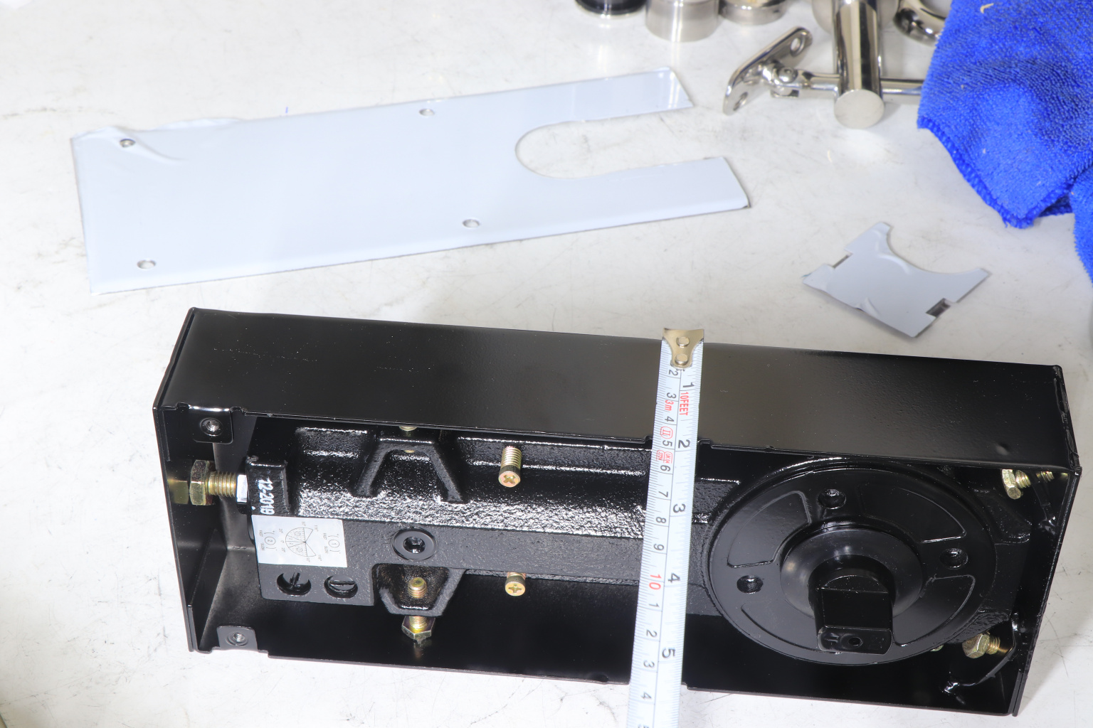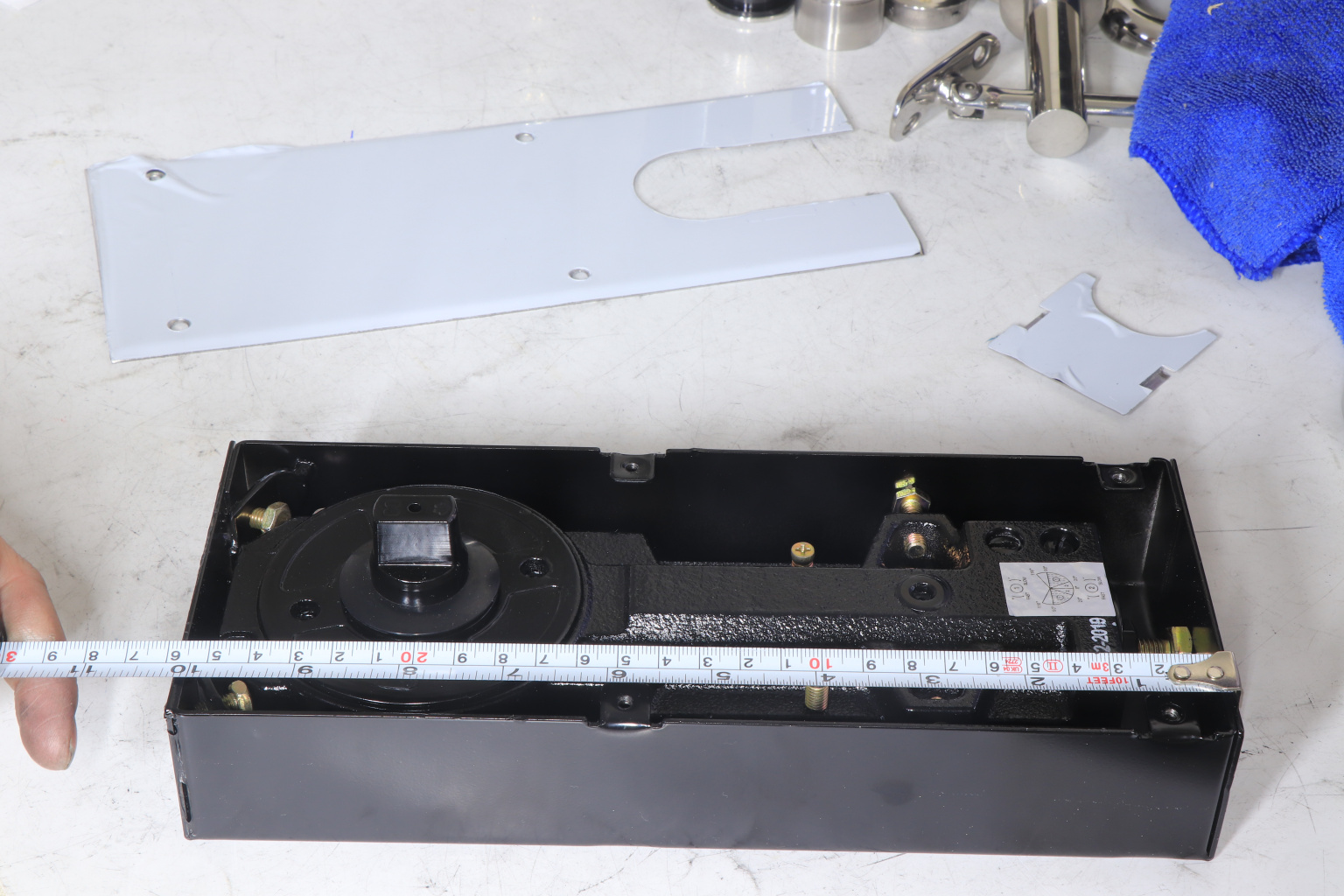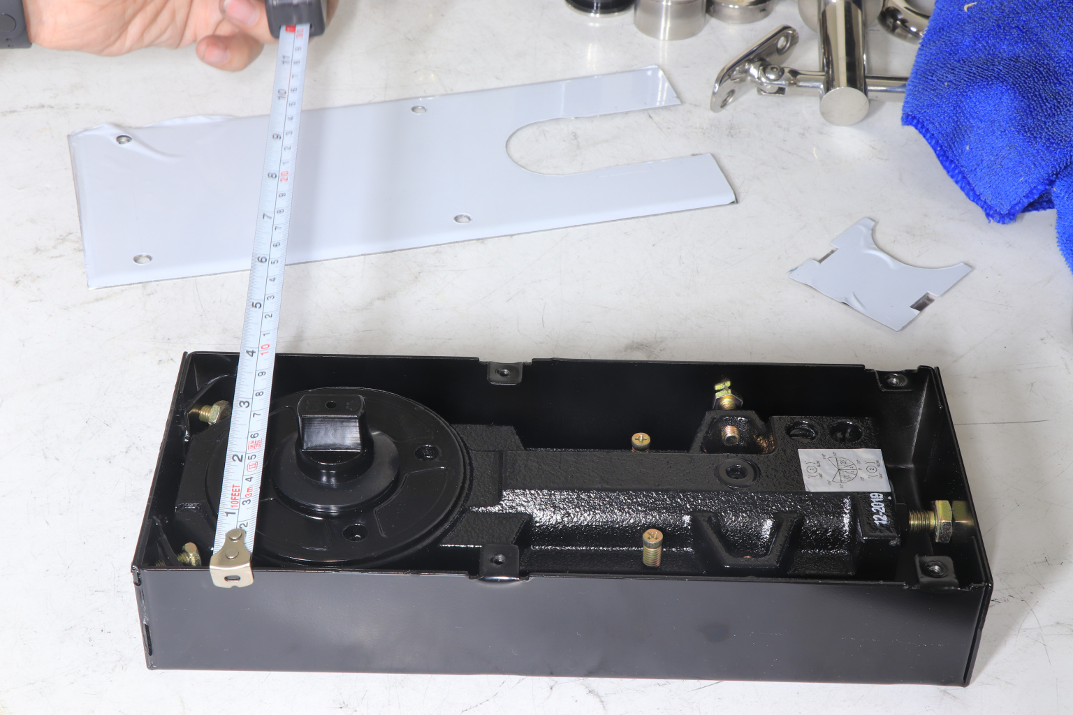 Для крепления кожуха доводчика в нише используем клеевой цемент и обеспечиваем строительным уровнем монтаж кожуха правильной геометрией с полом и дверью. После застывания клея - установка тела доводчика.