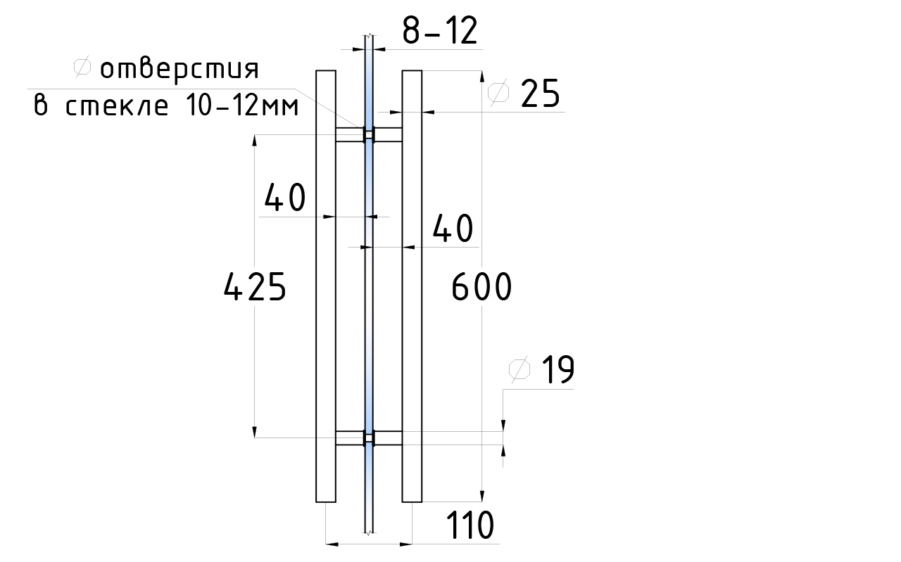 Ручка для стеклянной двери рейлинг двухсторонняя для стекла 8-12 мм, 25х425х600 мм, полированная t633-2-600 PSS