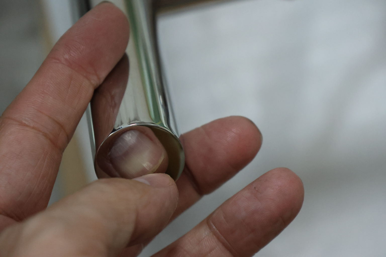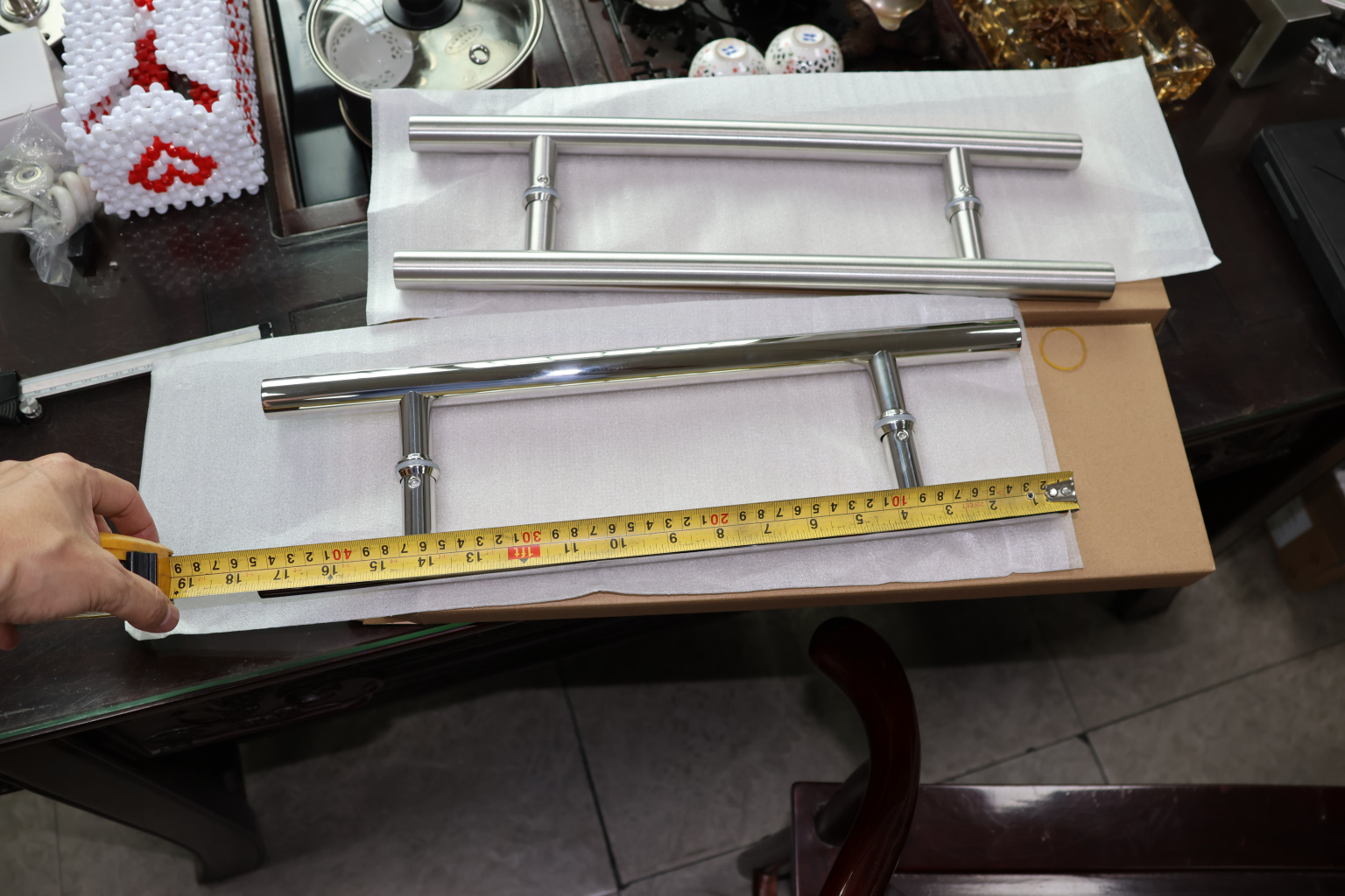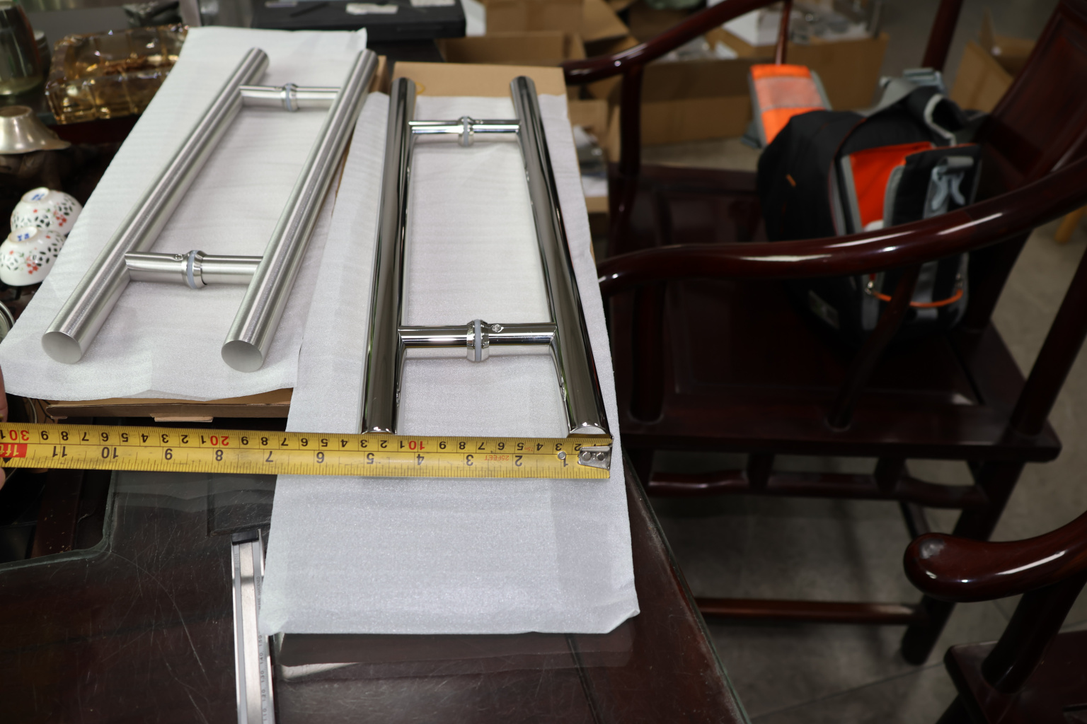 у основания ручки откручиваем с помощью шестигранника винты, делим ручку на две части, в заранее заготовленные отверстия вырезы в стекле 10-12 мм фиксируем первую часть ручки в отверстиях и с обратной стороны ответную часть затягиваем с помощью шестигранника