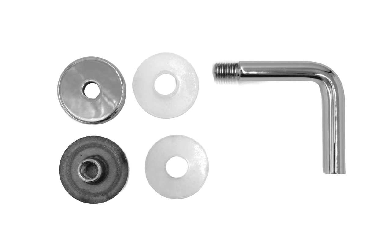 Для установки бокового держателя в стекле сверлится отверстие Ø17 мм, затем пристенок фиксируется затяжной гайкой в торце фланца. А сам поручень приваривается к загнутому наконечнику фитинга.