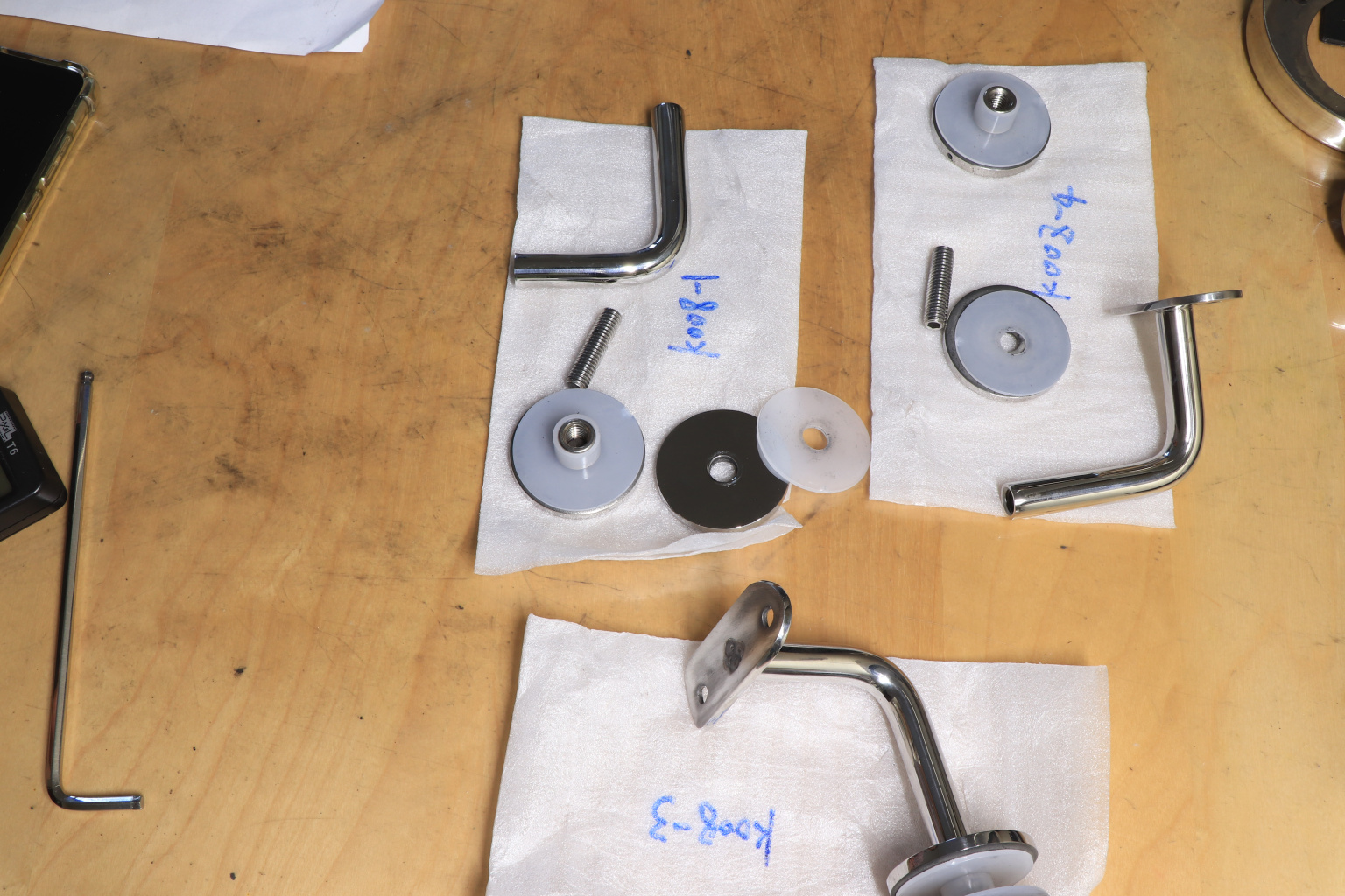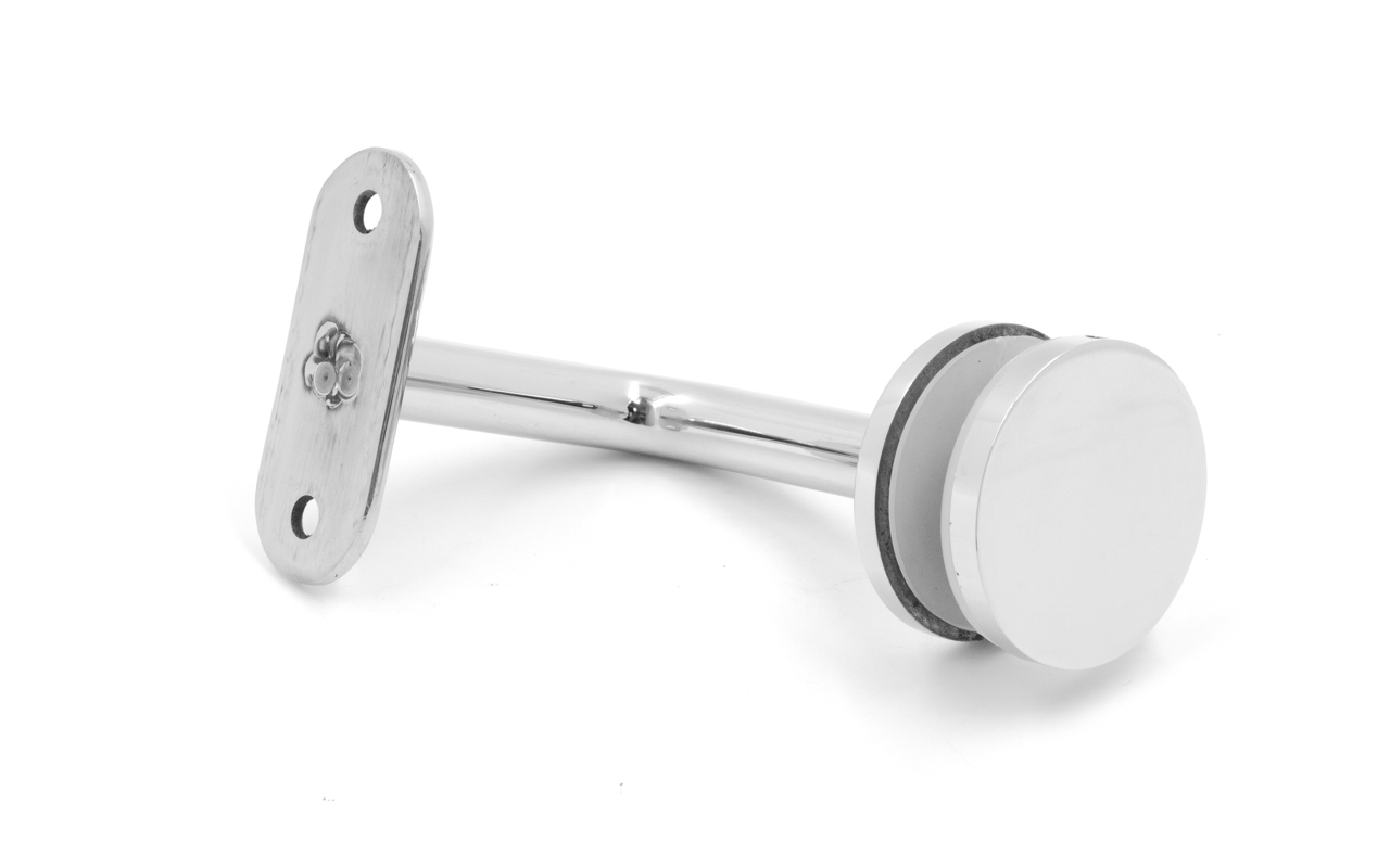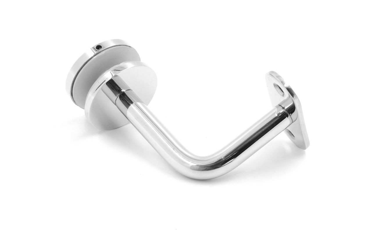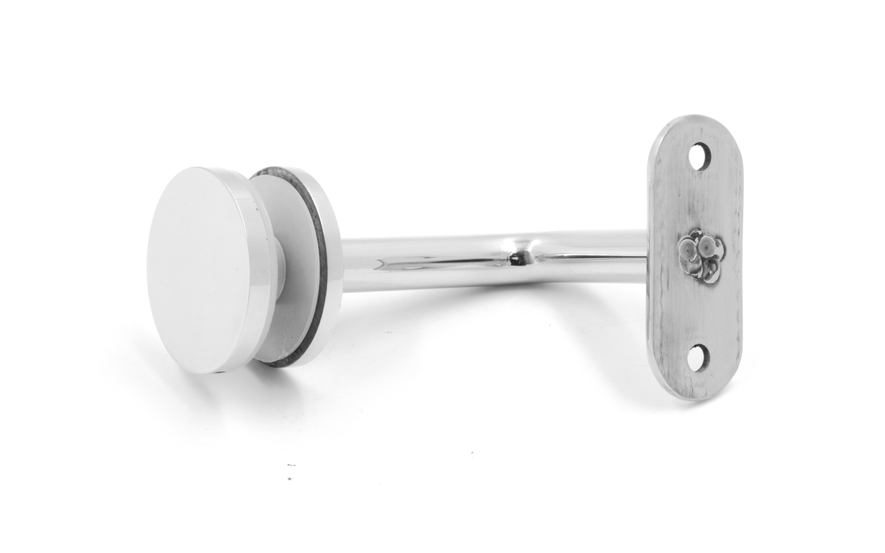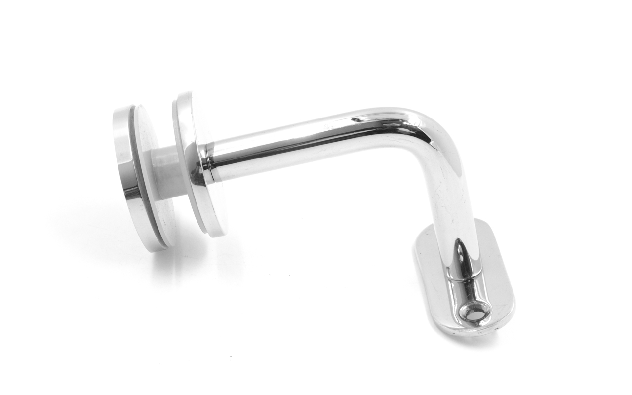Для установки бокового держателя в стекле сверлится отверстие Ø17 мм, затем пристенок фиксируется затяжной гайкой в торце фланца. А сам поручень приваривается к загнутому наконечнику фитинга.