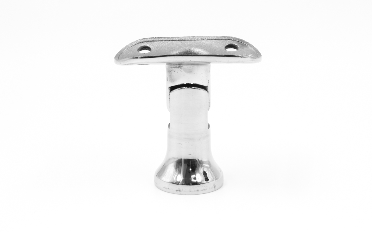 Наконечник стойки "колокольчик" на плоскость, с регулируемым ложементом с отверстиями под поручень диаметром Ø50.8 мм. Деталь литая, полированная, нержавеющая. Марка стали - AISI 304