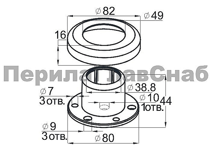 Цанга для крепления стоек из трубы Ø38.1 мм (k854-88). Крепится на 3 анкера М8 или на один по центру для надежной установки на деревянную ступень, плитку, бетон. В комплект входят две декоративные крышки.