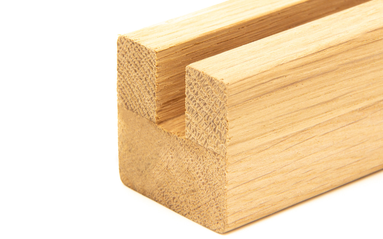 Брус из дуба, длиной от 1м до 5м, 40х40мм, обработанный, шлифованный, под покраску. Без поперечных сращений* – можно использовать лазурь (полупрозрачную краску, подчеркивающую рисунок дерева). Паз под стекло, как правило, делают на 1мм шире, чем толщина стекла. Глубина варьируется от 20 до 22 мм, при добавлении светодиодной подсветки в паз - до 27мм. Для монтажа используют силикон, например Ф-1129.
