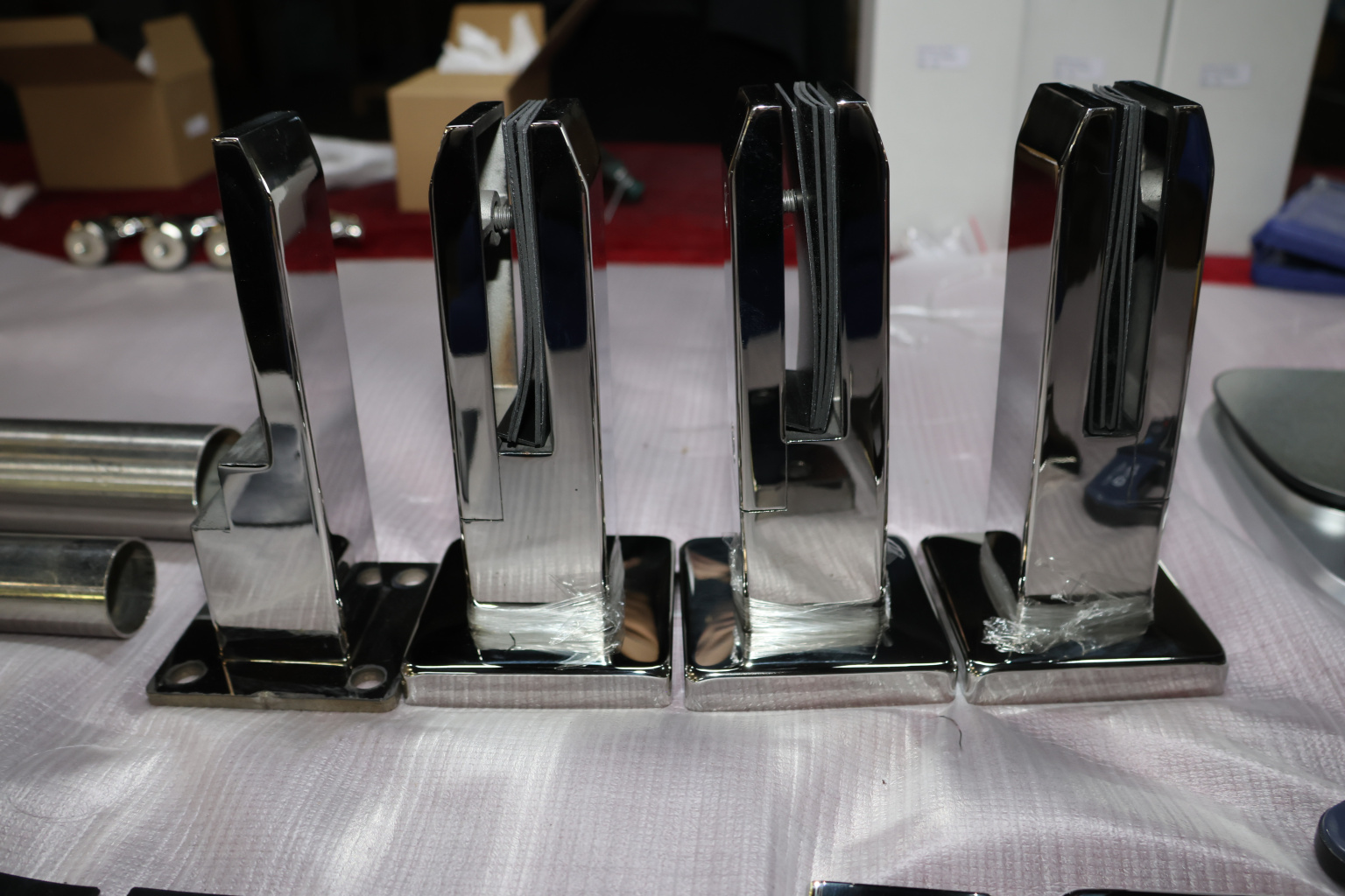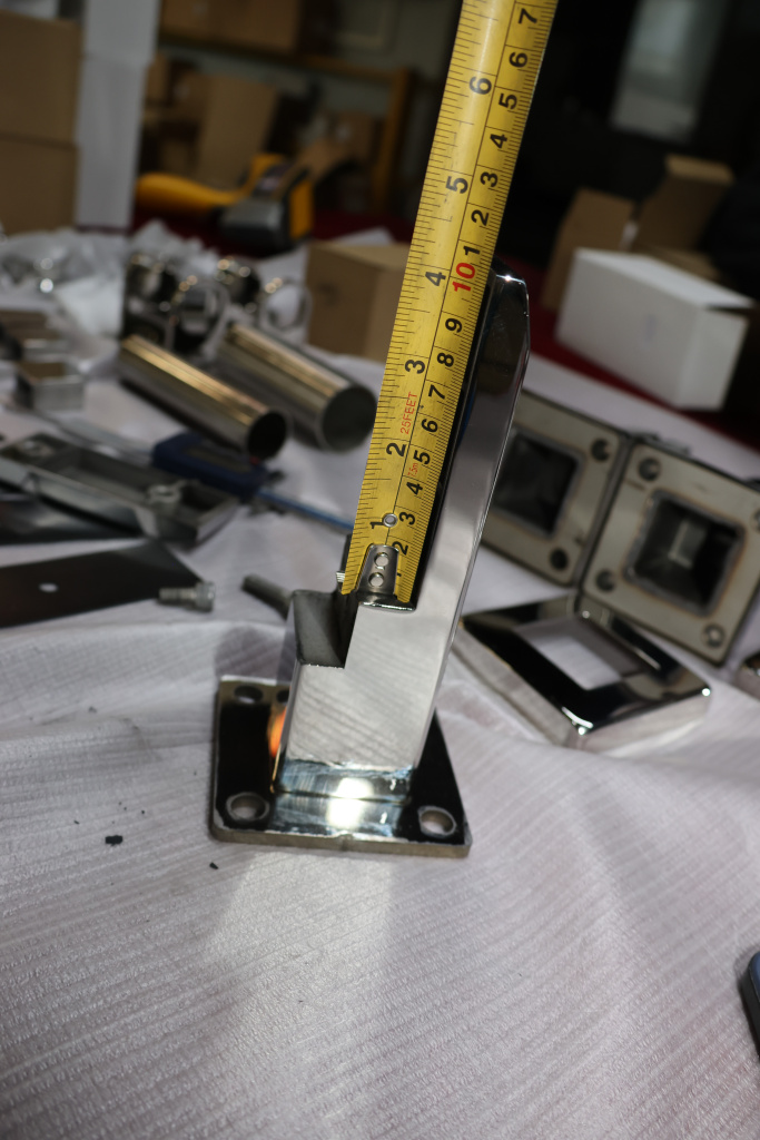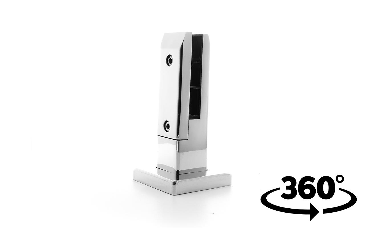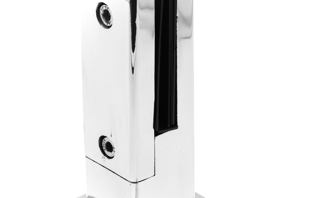 Стеклодержатель литой напольный, плоский 50х50х190 мм, для стекла 10-12 мм, полированный. Марка стали - AISI 304. Вам понадобиться для крепежа потайной винт под шестигранник k601-19-120. Необходимо отверстие в стекле- 16 мм.