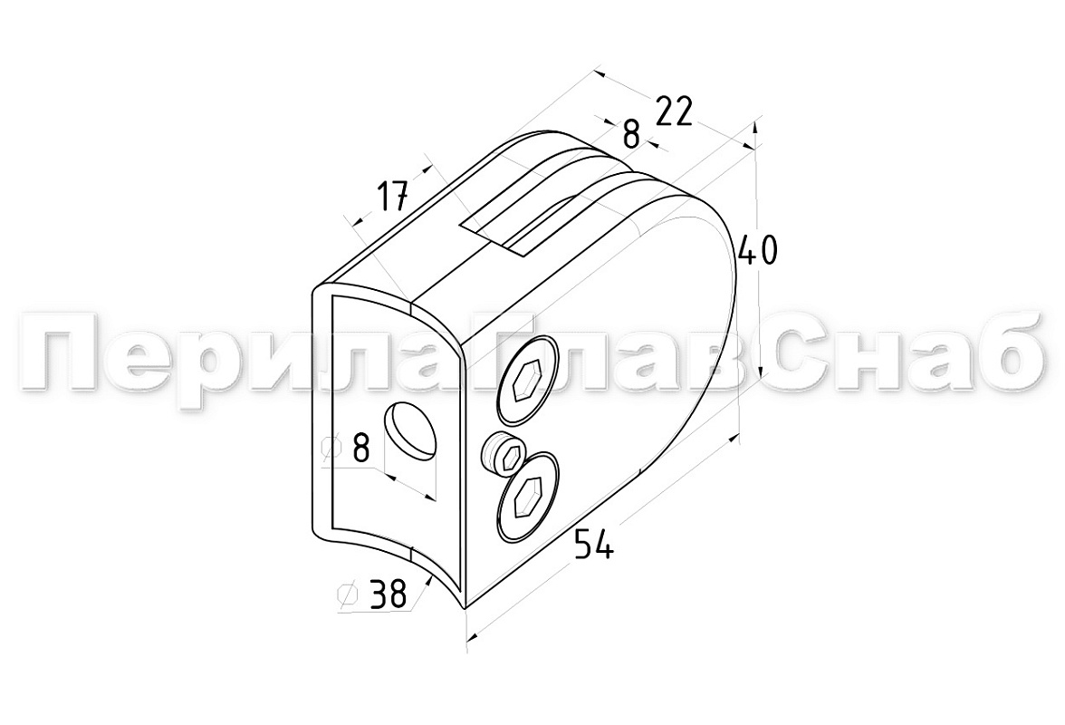 Стеклодержатель штампованный под стекло 8мм (4+4 мм), под стойку Ø38.1 мм 40х22х54, полированный (AISI 304) k538-2
