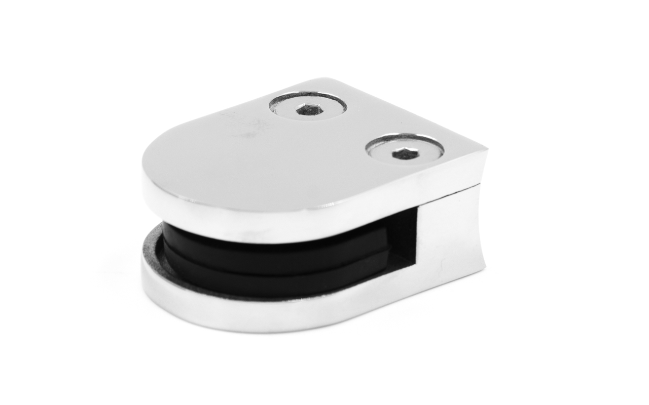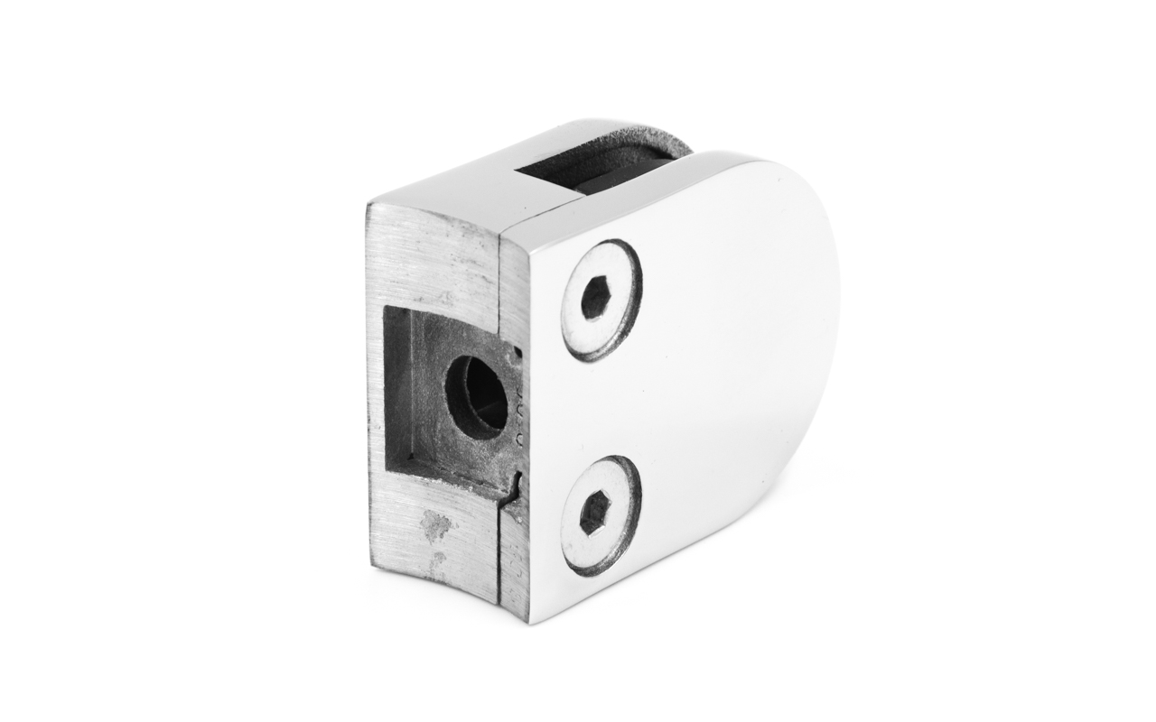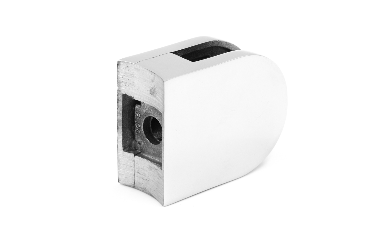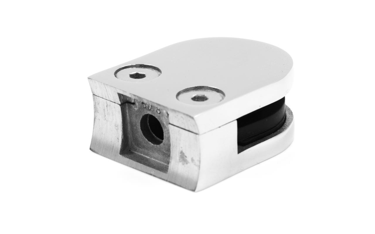 Стеклодержатель литой с вставками под стекло 8-10 мм, закругленный под Ø50.8 мм, 40х22х50, полированный. Марка стали - AISI 304