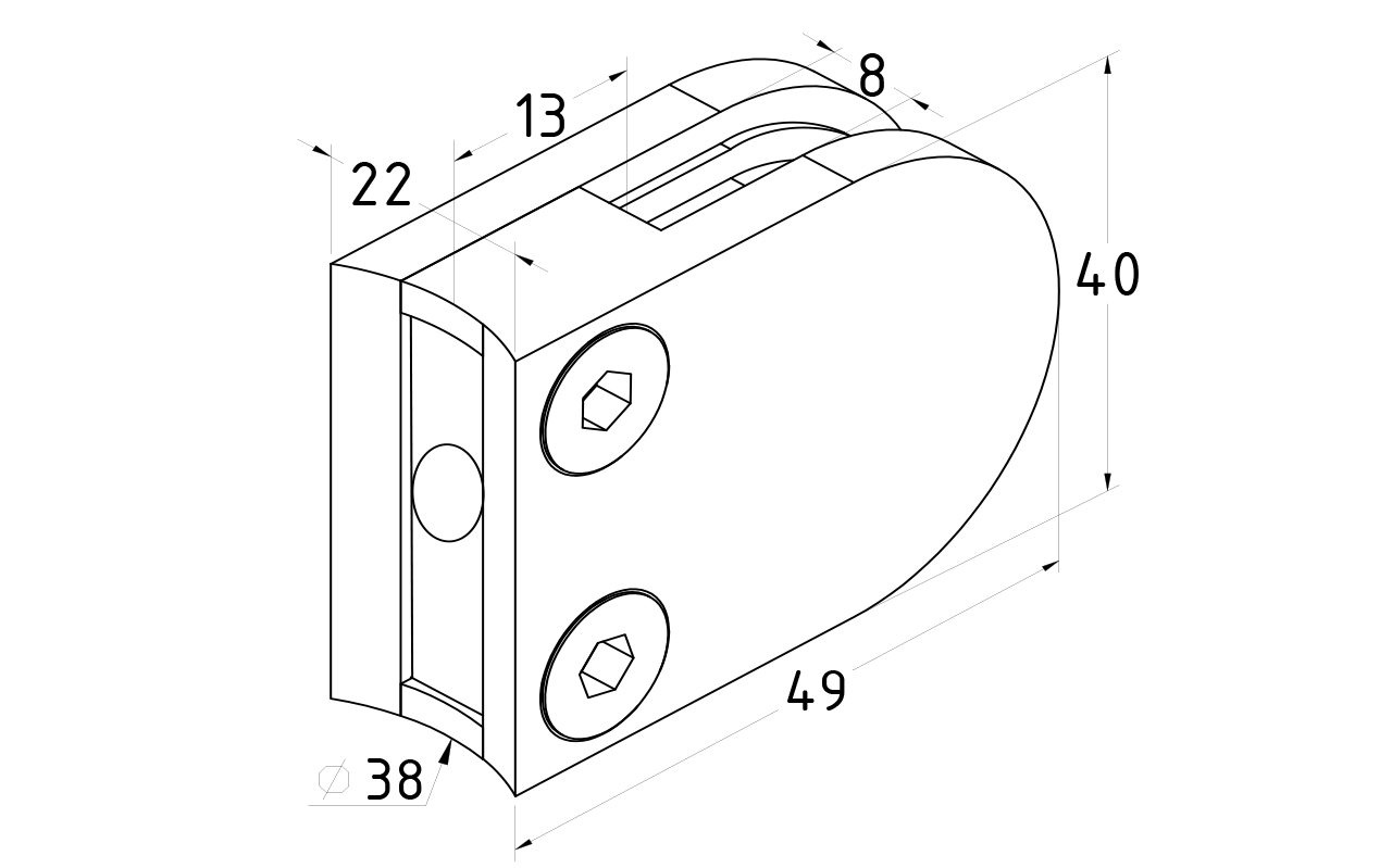 k001-4 стеклодержатель литой под стекло 8 мм под стойку Ø38.1 мм 40х22х49 полированный (AISI 304)