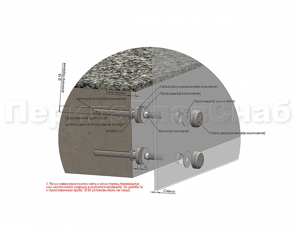 Вся конструкция устанавливается на химический анкер Ф-0799. Для затягивания гайки рекомендуем использовать ключ k367-2. Так же вам может понадобиться эксцентрик для стекла Ф-0530. Мы рекомендуем делать отверстие в стекле 30 мм для более простого монтажа (для регулировки стекла в плоскостях).