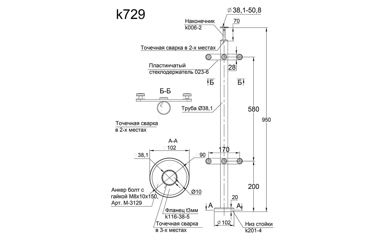 Готовые стойки – это экономия вашего времени и денег. Приобретая готовую стойку Вы можете собрать ограждение сами, не привлекая монтажную бригаду и экономя денежные средства на монтаже. Стойка легко монтируется к полу благодаря треханкернуму фланцу с отверстиями под анкер-болт М8 ( М-3129, М-3843, М-3838), а крепеж скрывает декоративная крышка идущая в комплекте стойки. Стекло крепится в стеклодержателе за счет отсоединяющейся одной половины стеклодержателя при помощи шестигранника ( k931, k932). Поручень из нержавеющей стали так же легко закрепить при помощи сверла по нержавеющей стали ( k961-03, k961-03.5, k961р-03.5, k961р-03) и самореза ( М-3850, М-3847, М-3215). Либо при помощи заклепки ( М-3214) и винта М6 ( М-3973). Если вы используете пластиковый или деревянный поручень, то его можно закрепить при помощи саморезов ( М-3217).