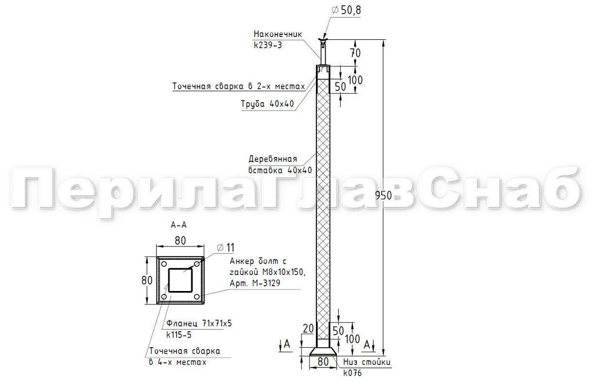 Готовая стойка 40х40х950 мм, деревянная нелакированная, со вставками из нержавеющей стали 2х100 мм k740