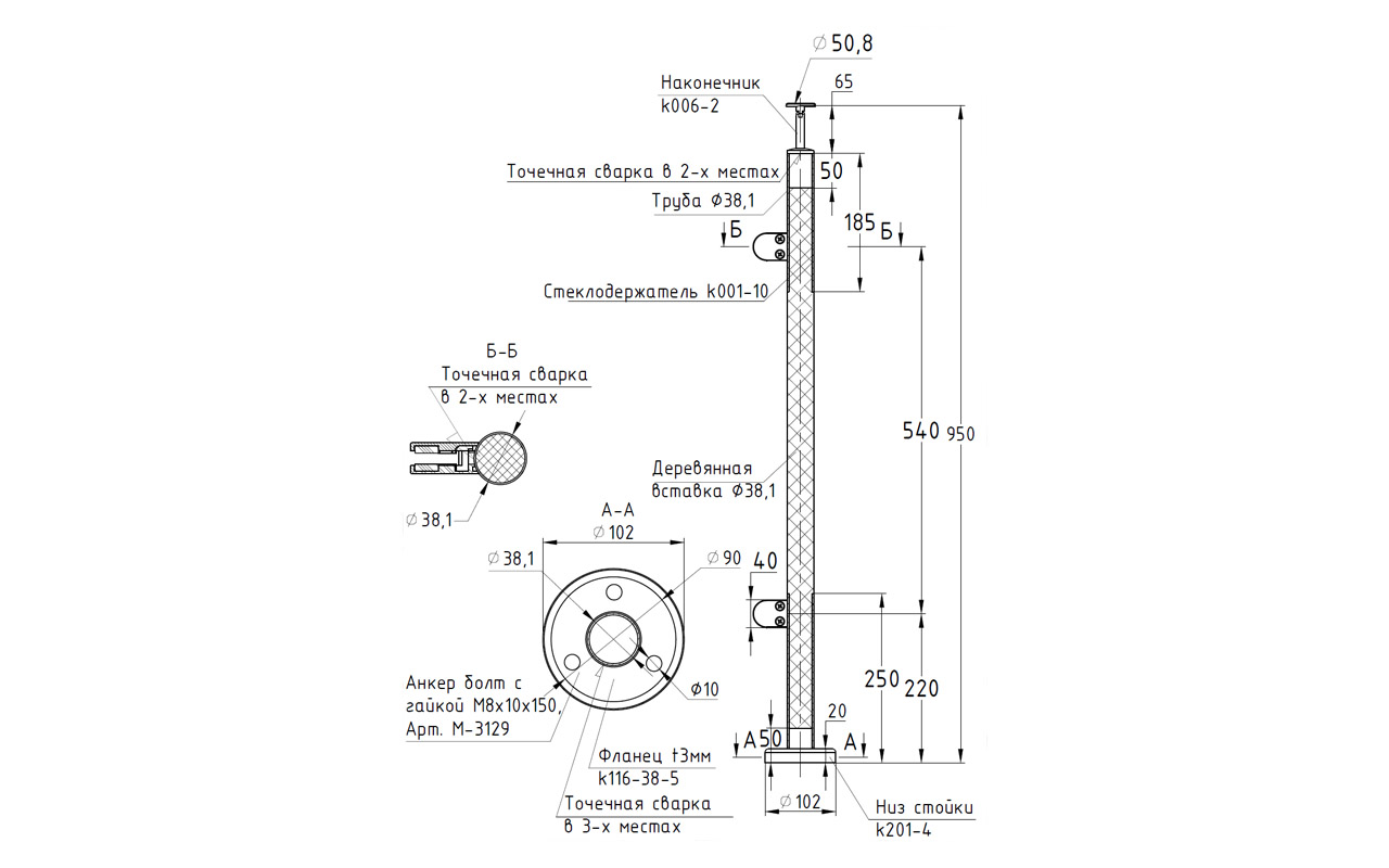 Готовые стойки – это экономия Вашего времени и денег. Приобретая готовую стойку Вы можете собрать ограждение сами, не привлекая монтажную бригаду и экономя денежные средства на монтаже. Стойка легко монтируется к полу благодаря треханкернуму фланцу с отверстиями под анкер-болт М8 ( , , ) или шпильку ( ; ) комплекте с хим анкером Ф-0799 или Ф-0800, а крепеж скрывает декоративная крышка идущая в комплекте стойки. Поручень из нержавеющей стали можно закрепить при помощи самореза ( , , ), либо при помощи заклепки ( ) и винта М6 ( М-3973) что на порядок эффективней, для крепления при помощи заклепок необходимо растачивать отверстие в ложементе. Если вы используете пластиковый ( , , , , , , ) или деревянный поручень, то его можно закрепить при помощи саморезов ( , М-3850, ). После покраски дубовой проставки подклеиваете клеем ( Ф-1127, Ф-1105). Стекло заказывается после установки стоек и снятия размеров. После того, как стекло готово к установке, при помощи шестигранника ( , ) разъединяете стеклодержатель, надеваете стекло и закручиваете обратно. Ограждение готово!