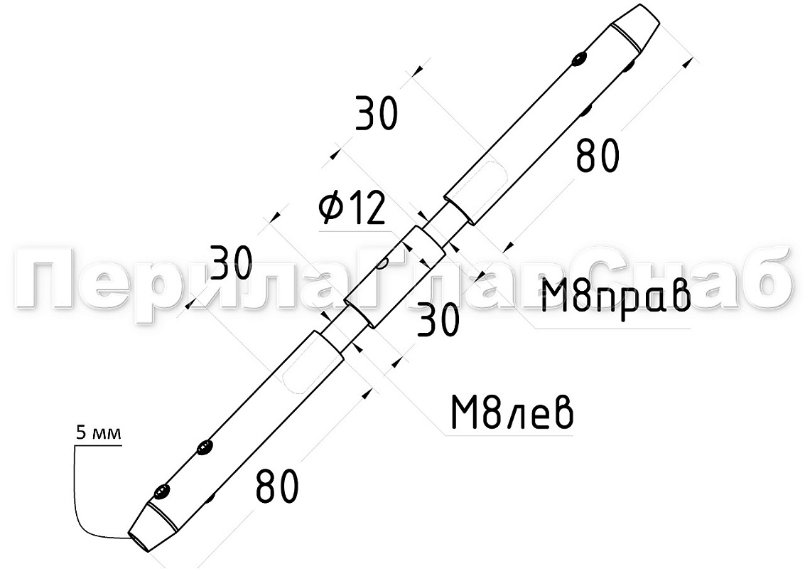 Служит для натяжения тросов в ограждениях. На концах талрепа при помощи зажимных винтов фиксируются трос. Натяжка троса производится через каждые 4-5 метра, с помощью талрепа. Для этого в центральной части талрепа сделана резьба с разным направлением вращения.