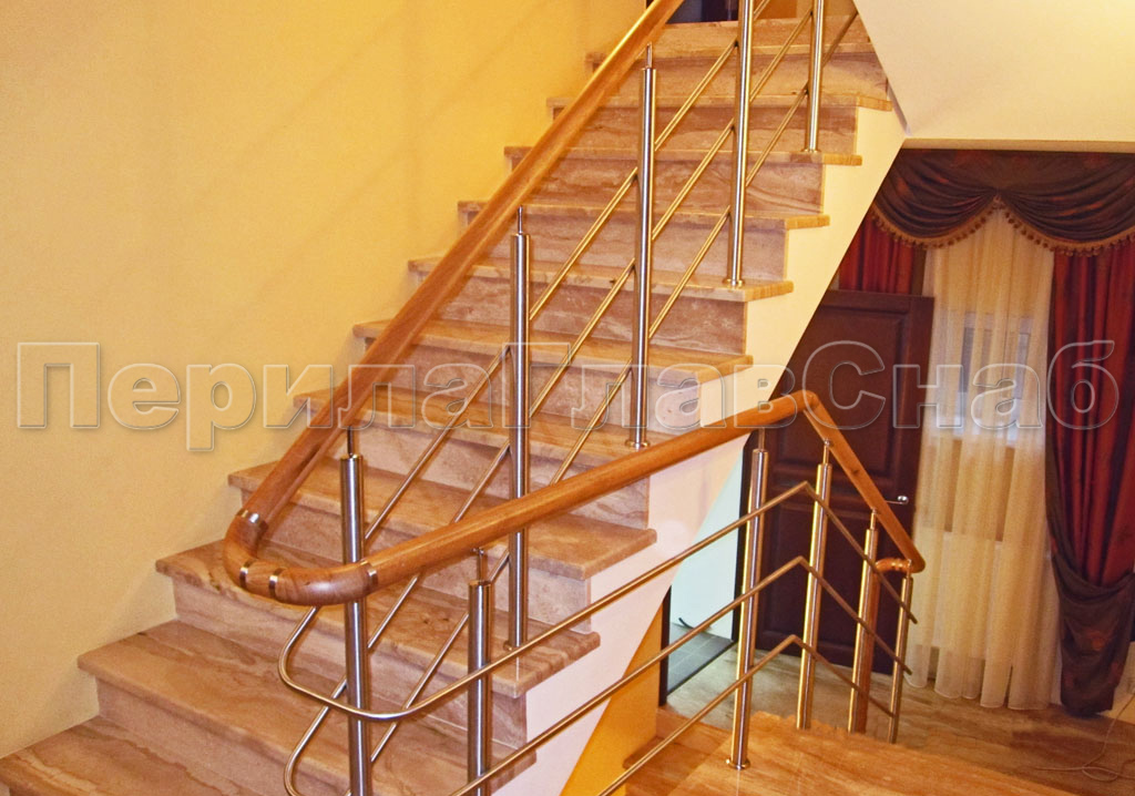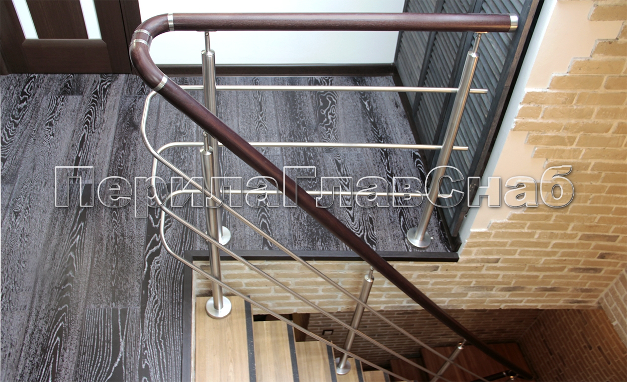 Нержавеющие ограждения без ригелей с круглым поручнем и стойками с деревянными вставками