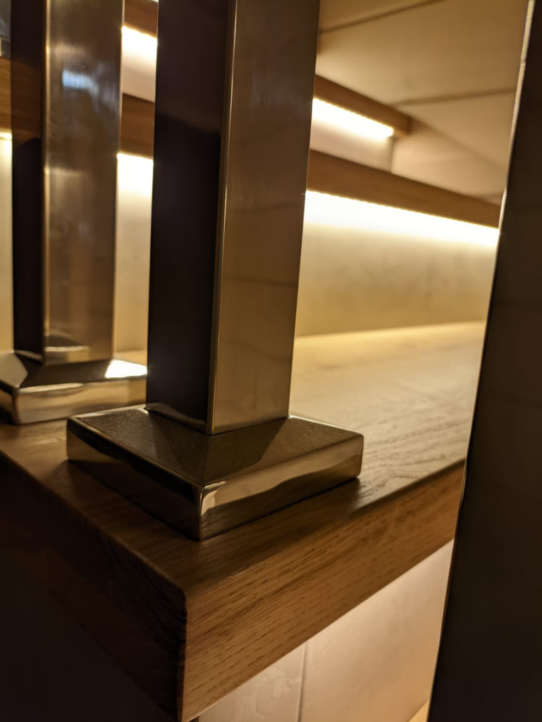Одной из ключевых особенностей проекта является сочетание нержавеющей стали и дерева дуба.