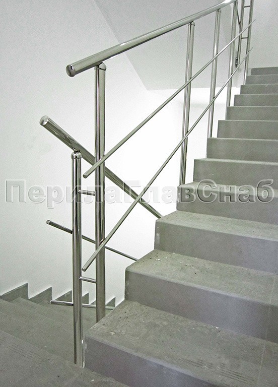 Значительной долей работы на данном объекте была установка лестничных ограждений внутри здания. Для этого объекта были смонтированы стойки и перила круглой формы из нержавеющей полированной стали. Боковое крепление стоек было продиктовано ограниченным пространством на лестничном марше. Ригели и поручни между собой не завязаны и снабжены двумя перемычками. При этом полностью соблюдены нормы пожарной безопасности и расстояние между маршами не менее 100 мм, предусмотренное для протягивания пожарного шланга.