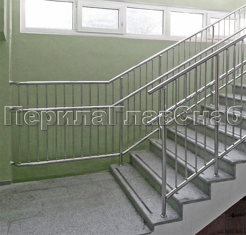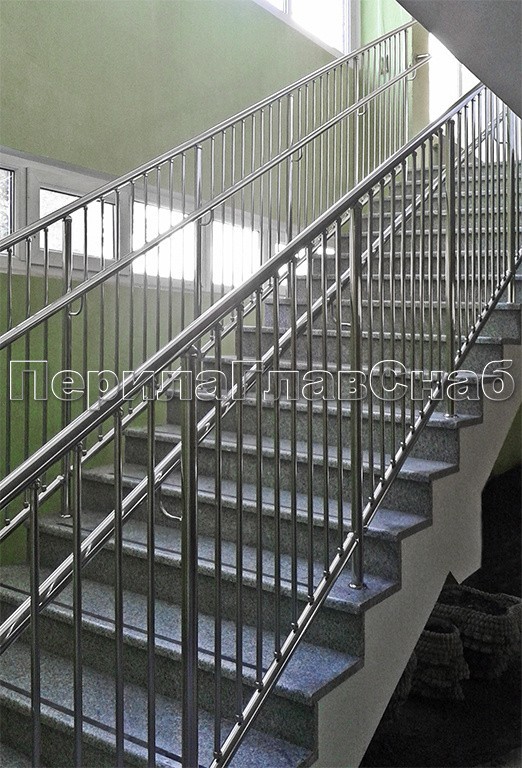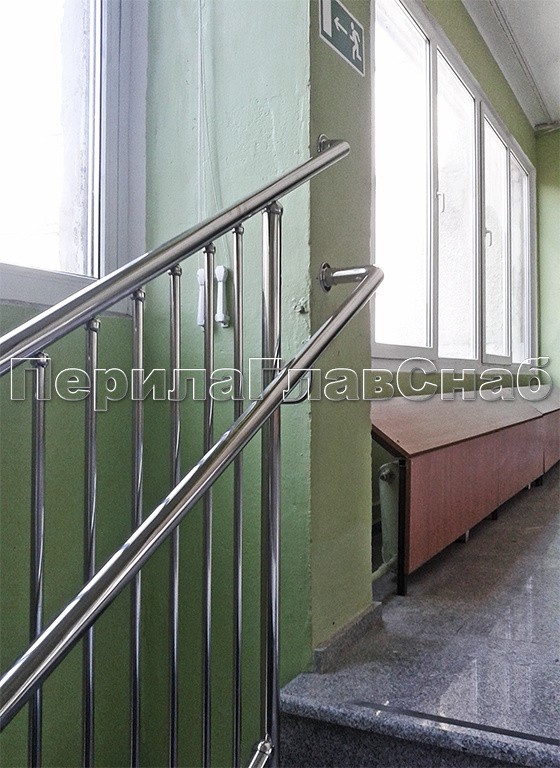 Ограждение с вертикальным заполнением, установлено в детском (образовательном) учреждении. Два поручня на разной высоте, чтобы детям тоже было удобно.