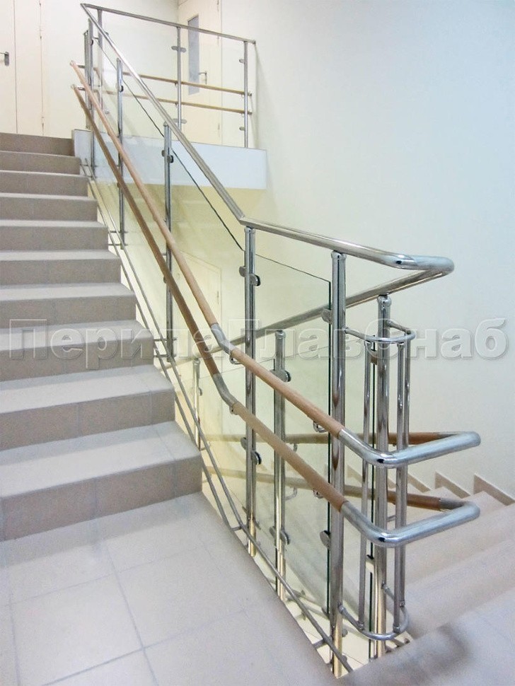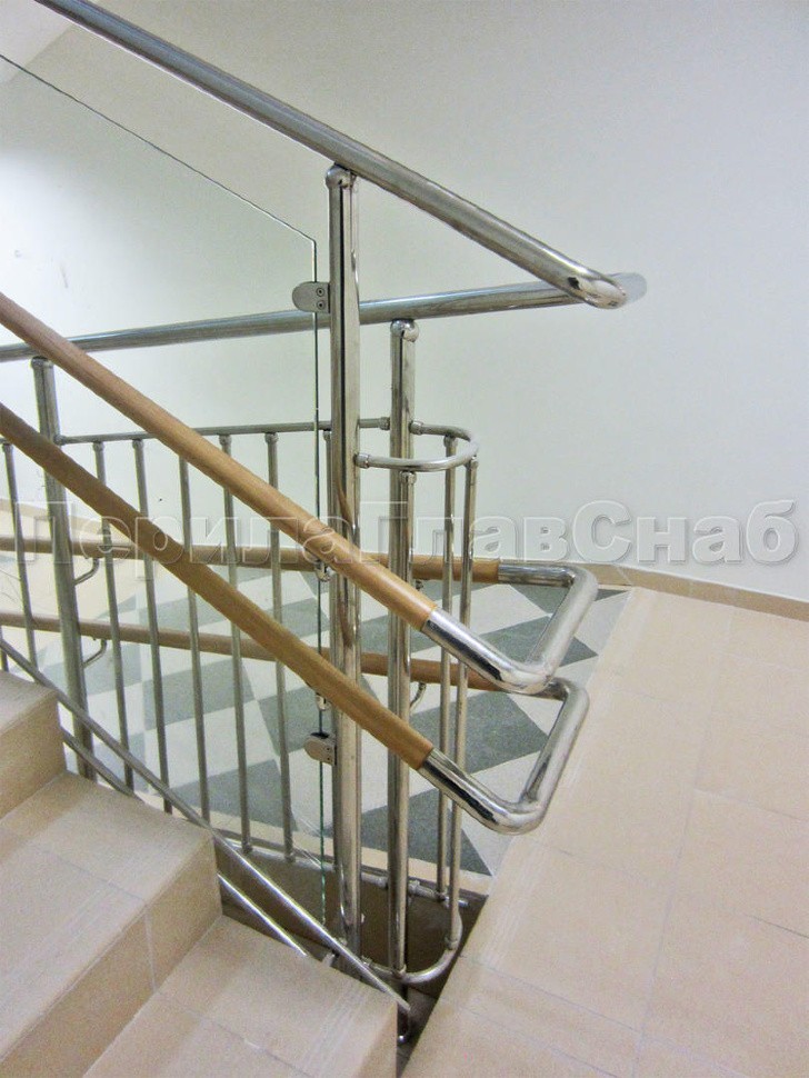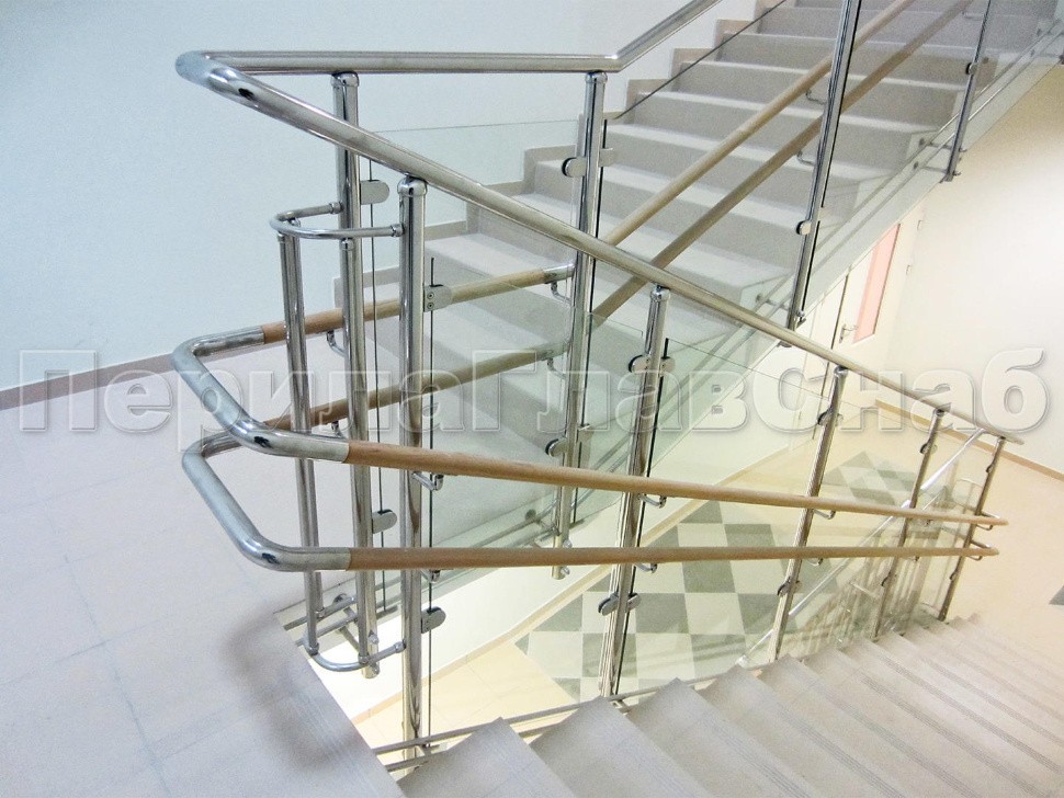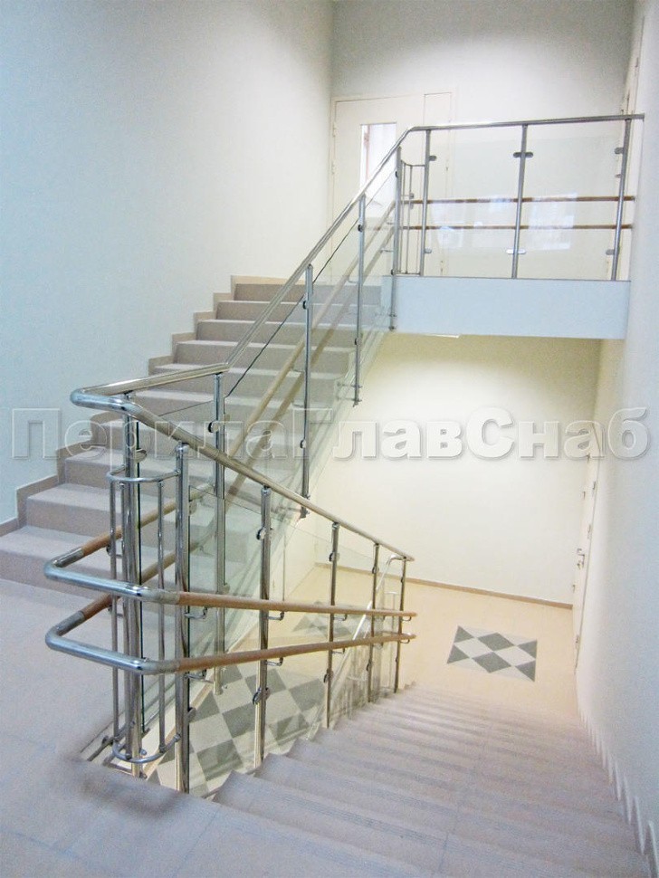 Ограждение  со стеклом (на зажимных стеклодержателях) и стойками. Стойки установлены в торец ступеней. Поручни завязаны на поворотах.