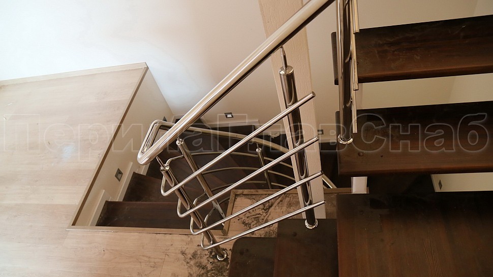 Поручень диаметром 38,1 мм из прямых и радиусных участков прокатанных по месту на станке ( при прокатке поручень приобретает в сечении овальную форму). Крепление нержавеющих элементов ограждения между собой выполнено при помощи точечной аргонно-дуговой сварки, длина швов после нее — 2 мм, на финальном этапе монтажа швы были зачищены и отполированы.