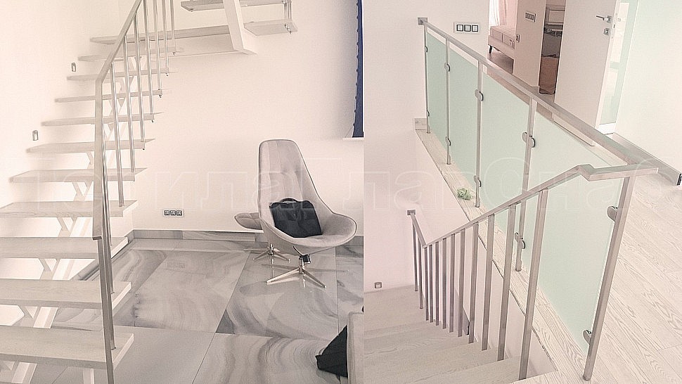 Ограждения из шлифованной нержавеющей стали. Высотой 950 мм и стойками 20х20 мм, крепление сверху через деревянную ступень заказчика и основания ступени металла 3 мм, устанавливаются в каждую ступень, на прямых участках не более 300 мм друг от друга; низ стойки декоративная крышка, поручень 40х20 мм, окончание поручня заглушка, поручень завязан. Крепление нержавеющих элементов ограждения между собой точечная аргонно-дуговая сварка, длина швов 2 мм, с последующей зачисткой и полировкой.