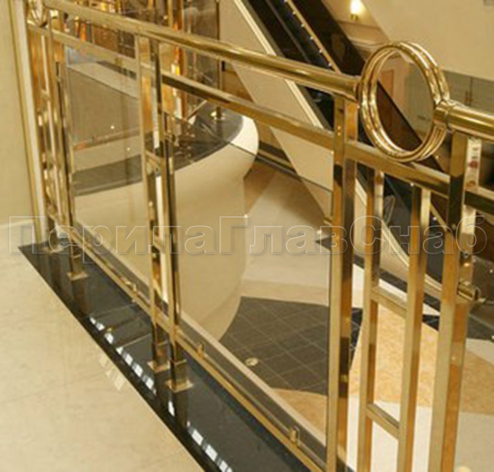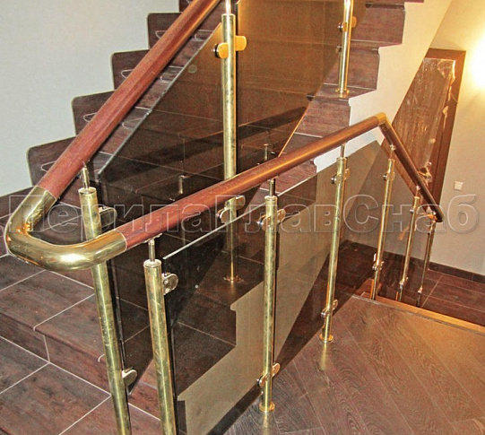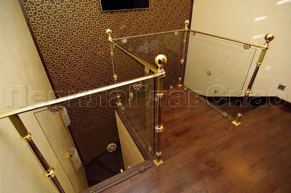 Записаться на встречу Ограждение лестницы со стеклом, тонированным в массе, стойки и завязки поручня из латуни