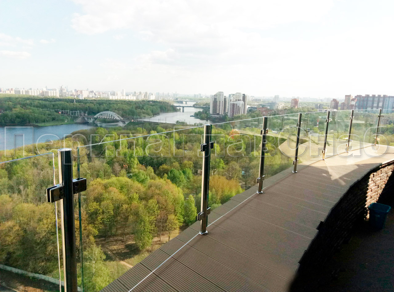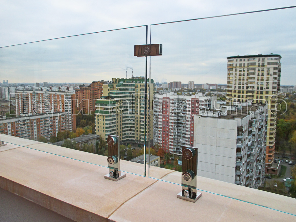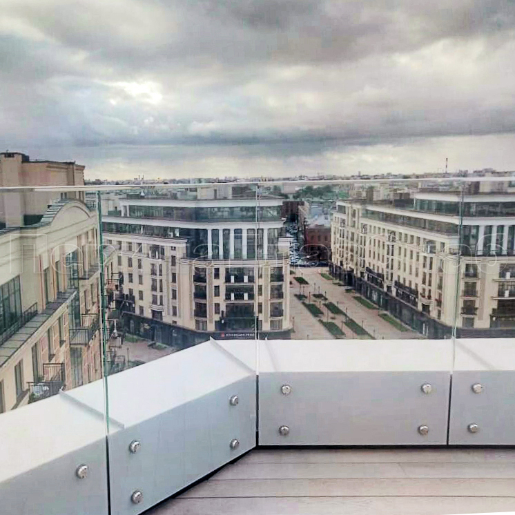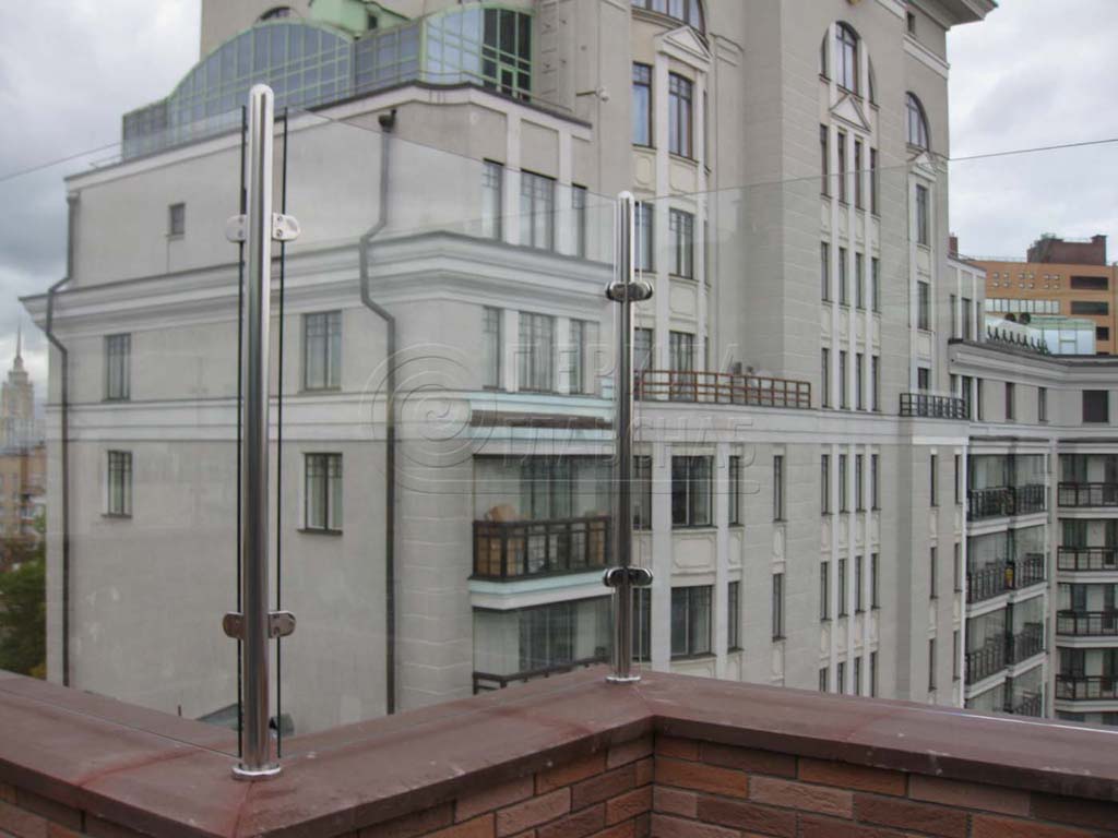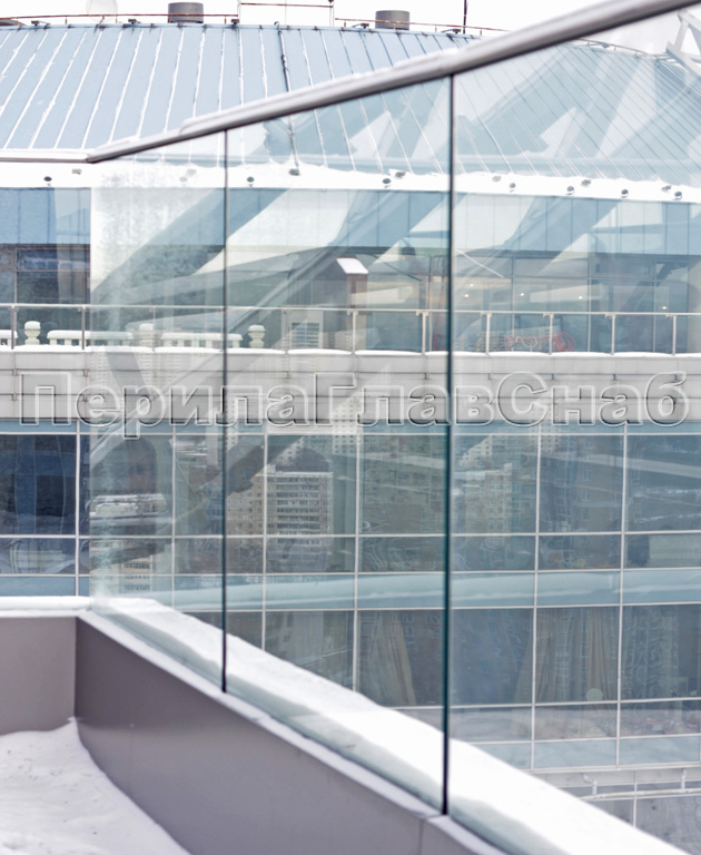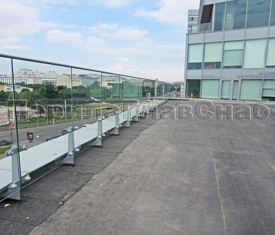 Стеклянные ограждения кровли со стойками на крыше многоэтажного дома. Дешевый аналог.