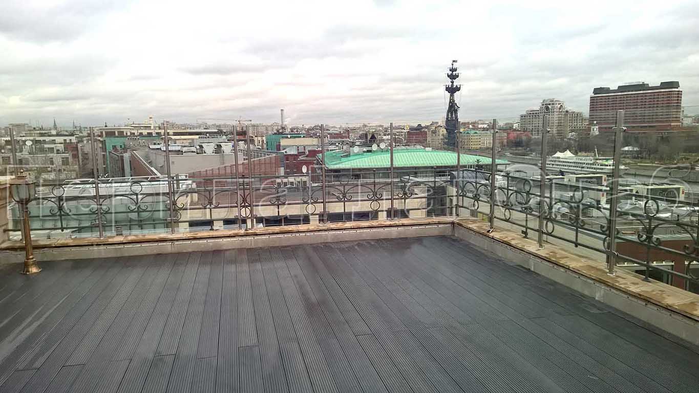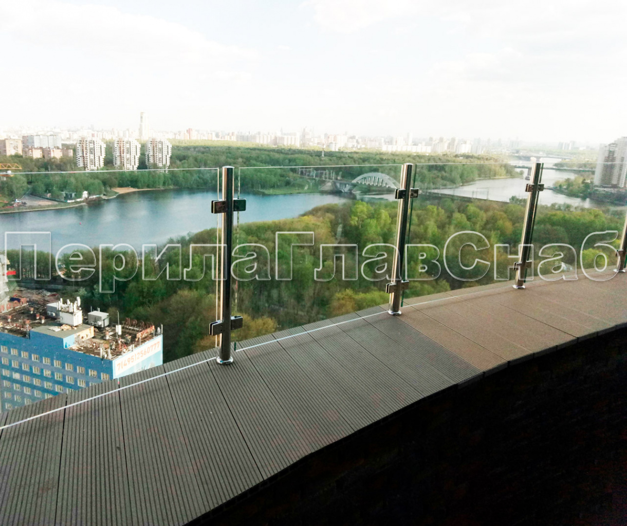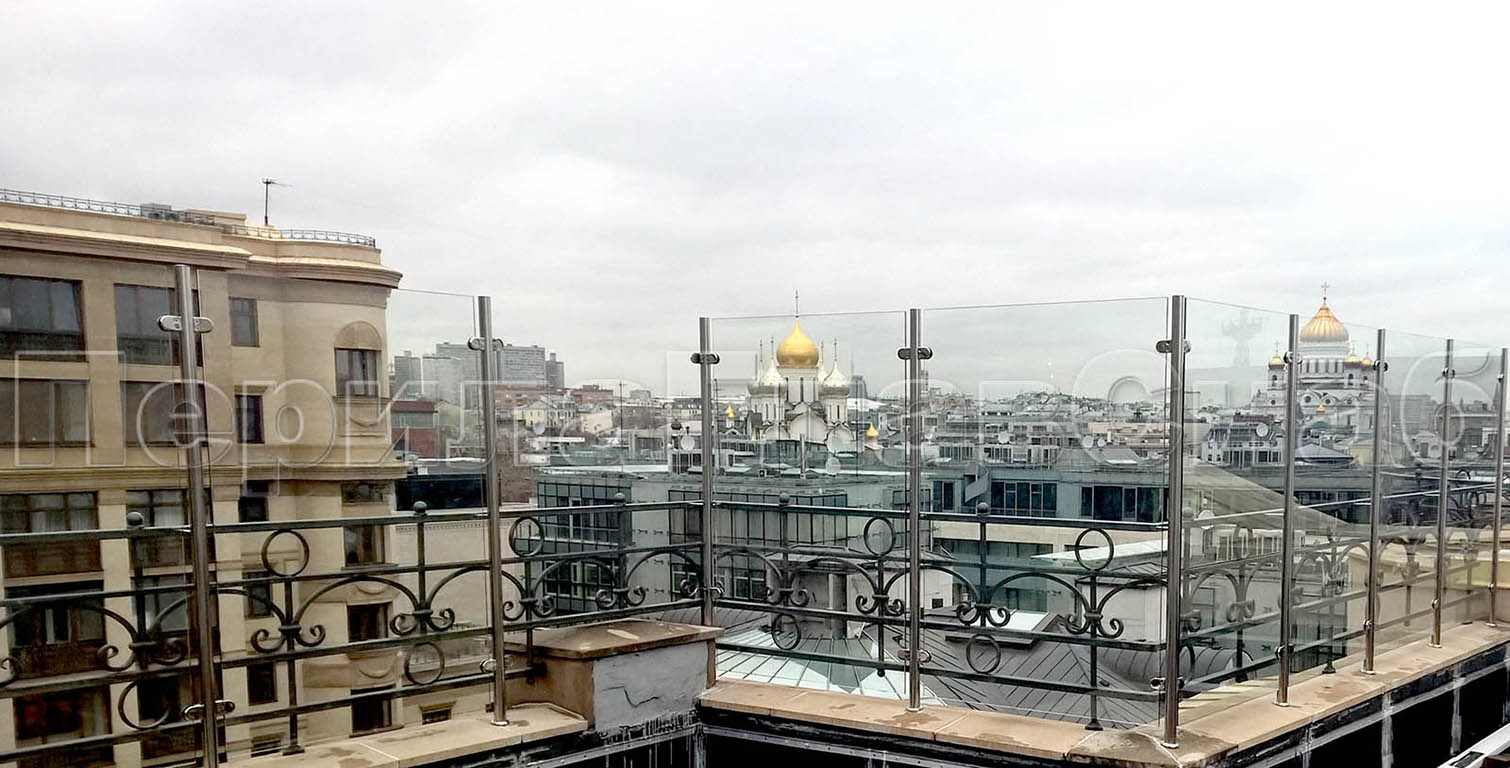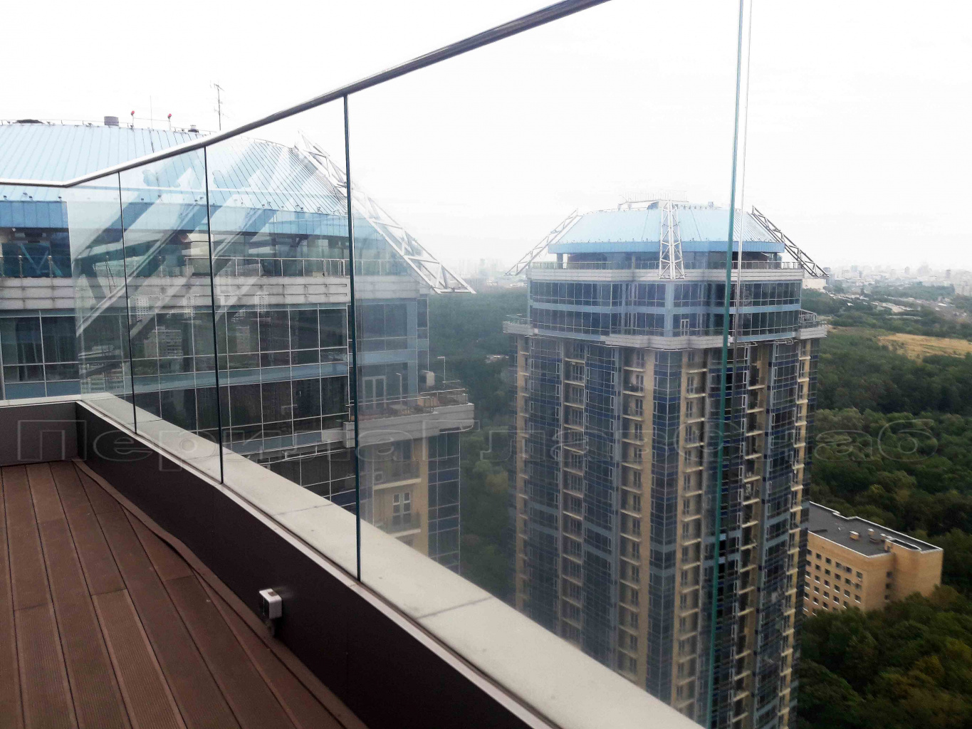 Стеклянные ограждения кровли со стойками на крыше многоэтажного дома. Дешевый аналог.