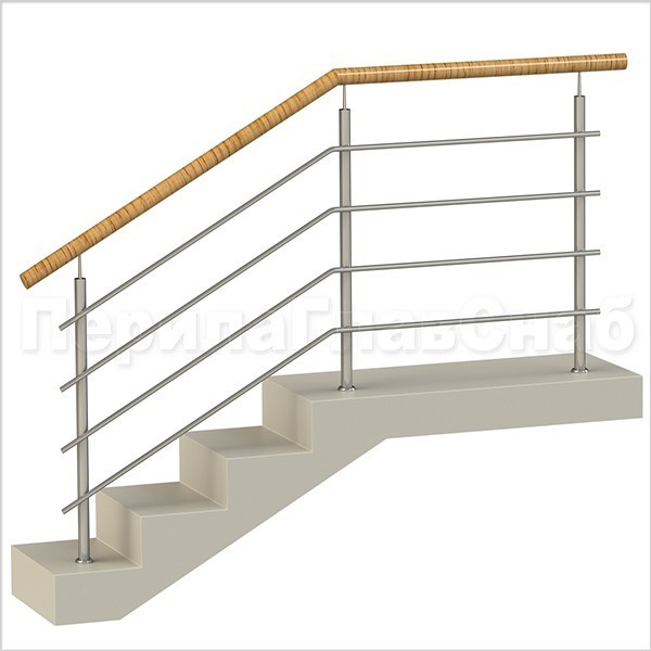 Четыре ригеля на держателях, квадратный деревянный поручень и квадратные стойки