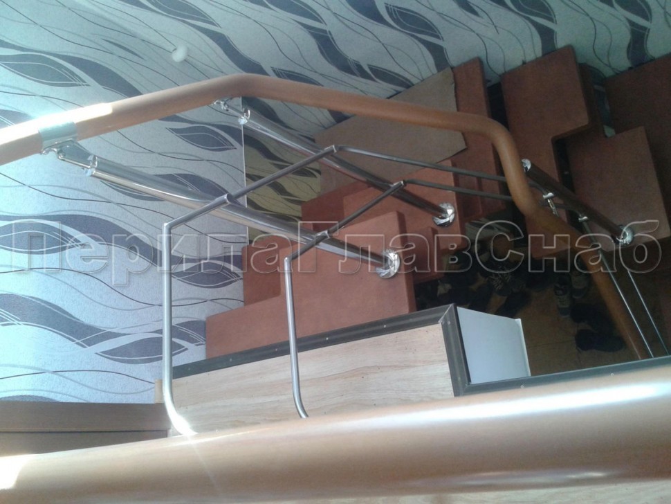 Три ригеля на сварке, квадратный деревянный поручень и круглые стойки