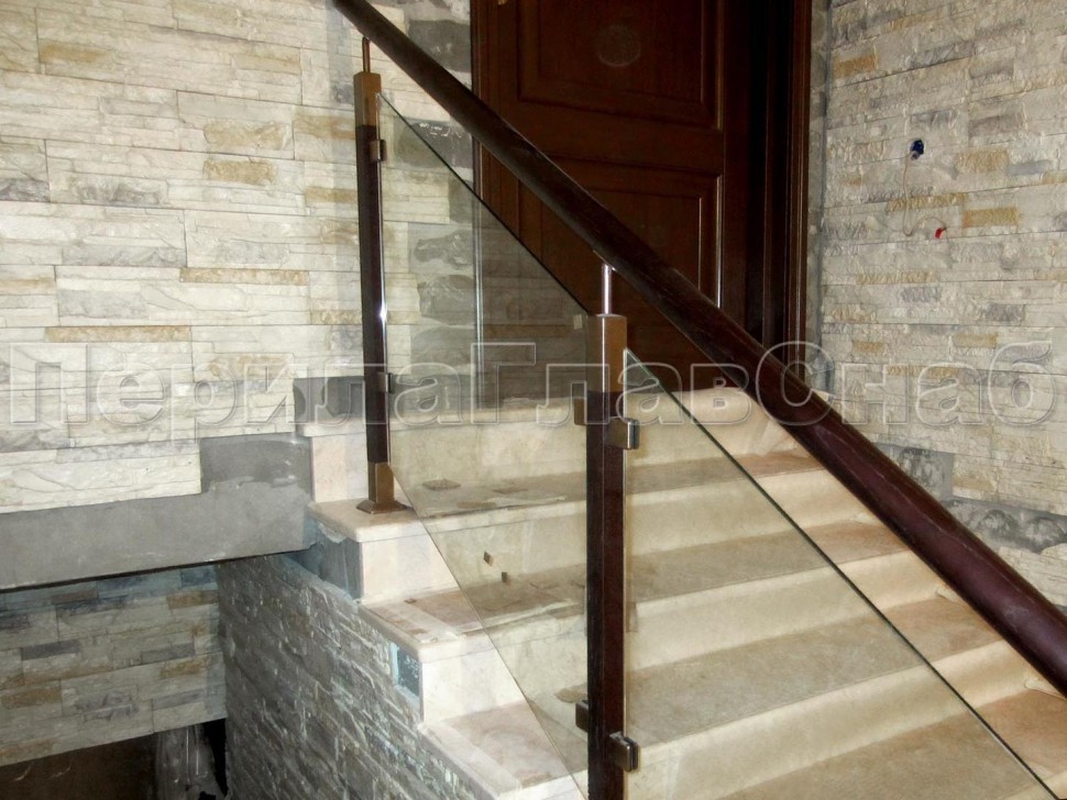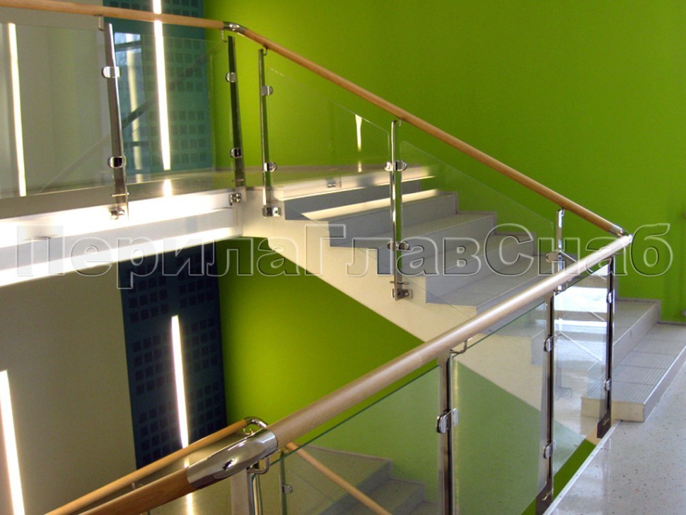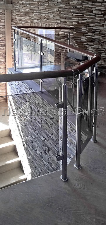 Записаться на встречу Ограждение с деревянным поручнем, стеклом и стойками