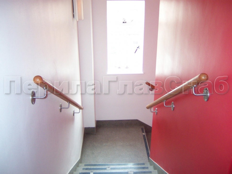 Два ригеля на держателях, круглый деревянный поручень и круглые стойки