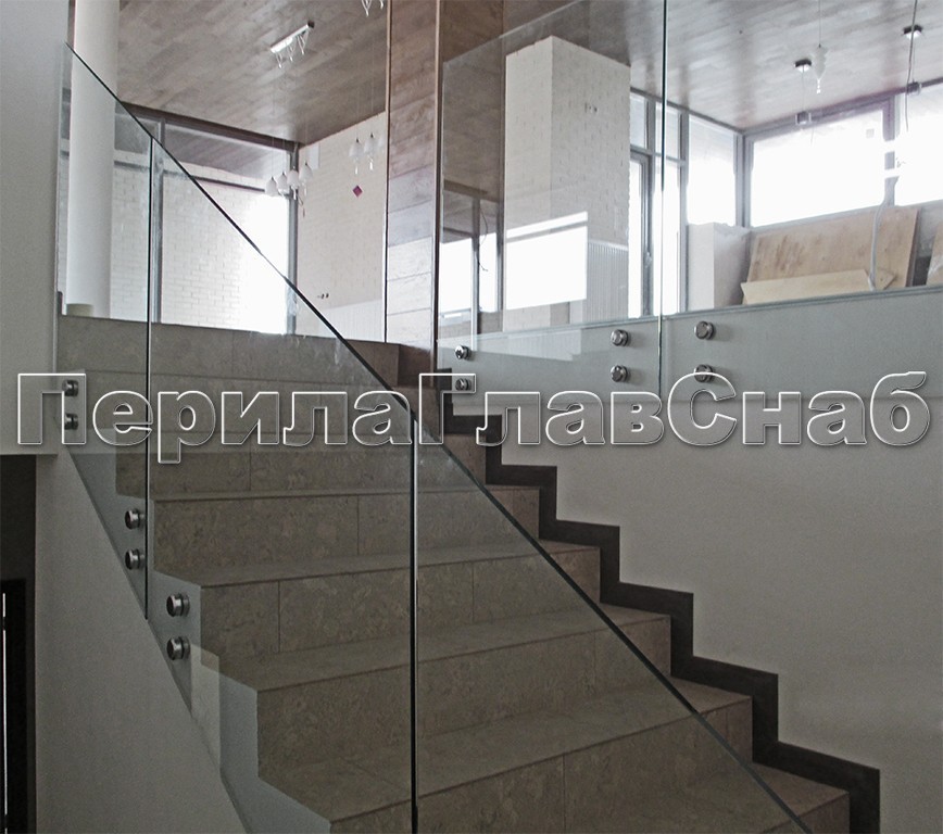 Ограждение с профильным поручнем с пазом на точечном креплении на лестнице