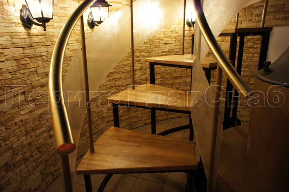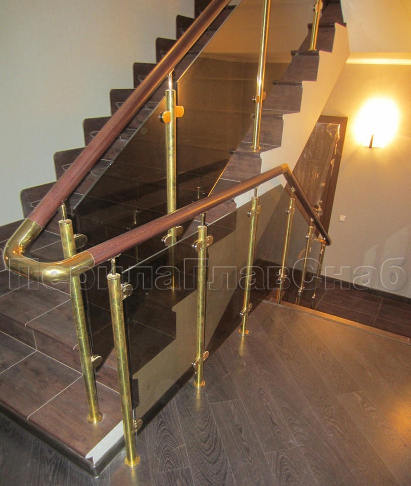 Ограждение лестницы со стеклом, тонированным в массе, стойки и завязки поручня из латуни