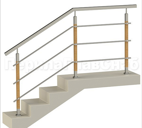 Три ригеля на сварке, квадратный деревянный поручень и круглые стойки