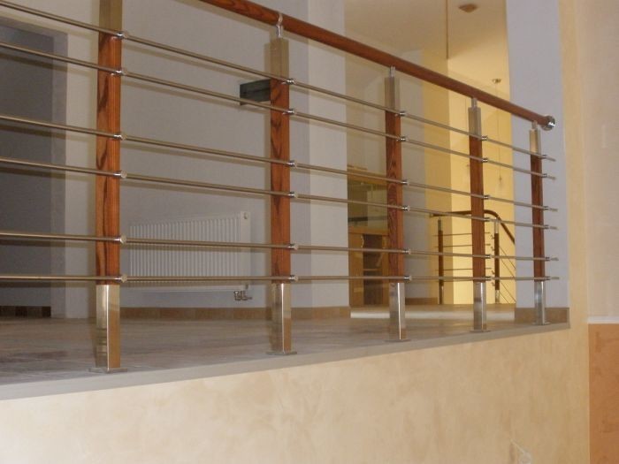 Четыре ригеля на держателях, квадратный деревянный поручень и квадратные стойки
