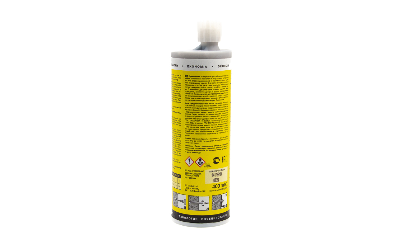 В состав химического анкера входит быстроотверждаемая синтетическая полиэстероидная смола в стироле. Используется в полнотелых и пустотелых материалах (керамический и силикатный кирпич, бетон, природный камень).
