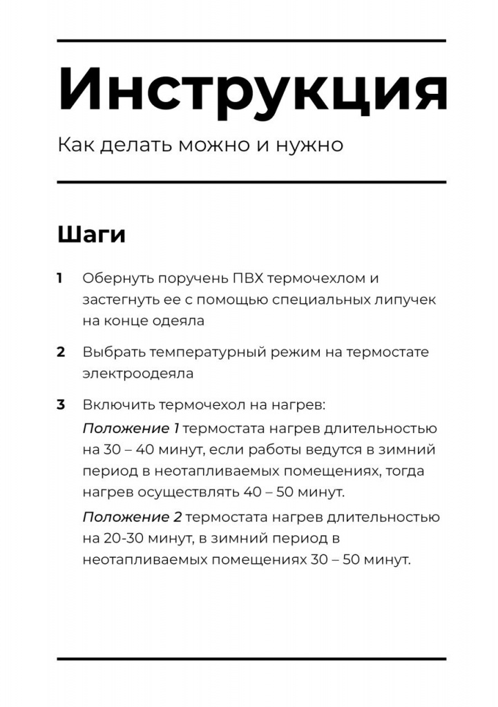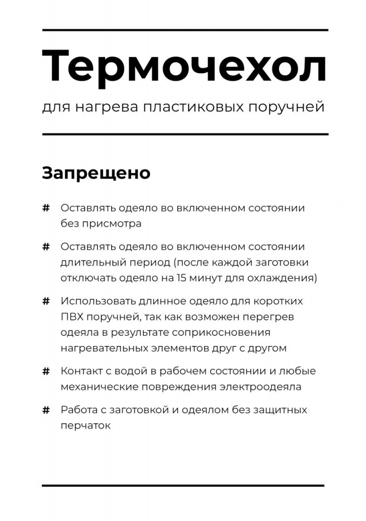 - Использовать длинное одеяло для коротких ПВХ поручней, так как возможен перегрев одеяла в результате соприкосновения нагревательных элементов друг с другом