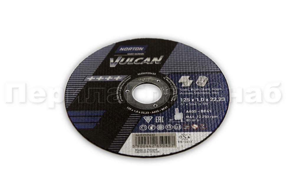 Отрезной диск от компании Norton предназначен для работы по металу и нержавеющей стали, используется угловых шлифовальных машинах. Диск не содержит железо, серу и хлор, что способствует более чистому резу. Диаметр диска 125 мм, а его толщина 1 мм. Зернистость диска P60, зерна выполнены из оксида алюминия. Максимальная скорость вращения диска 80 м/с.