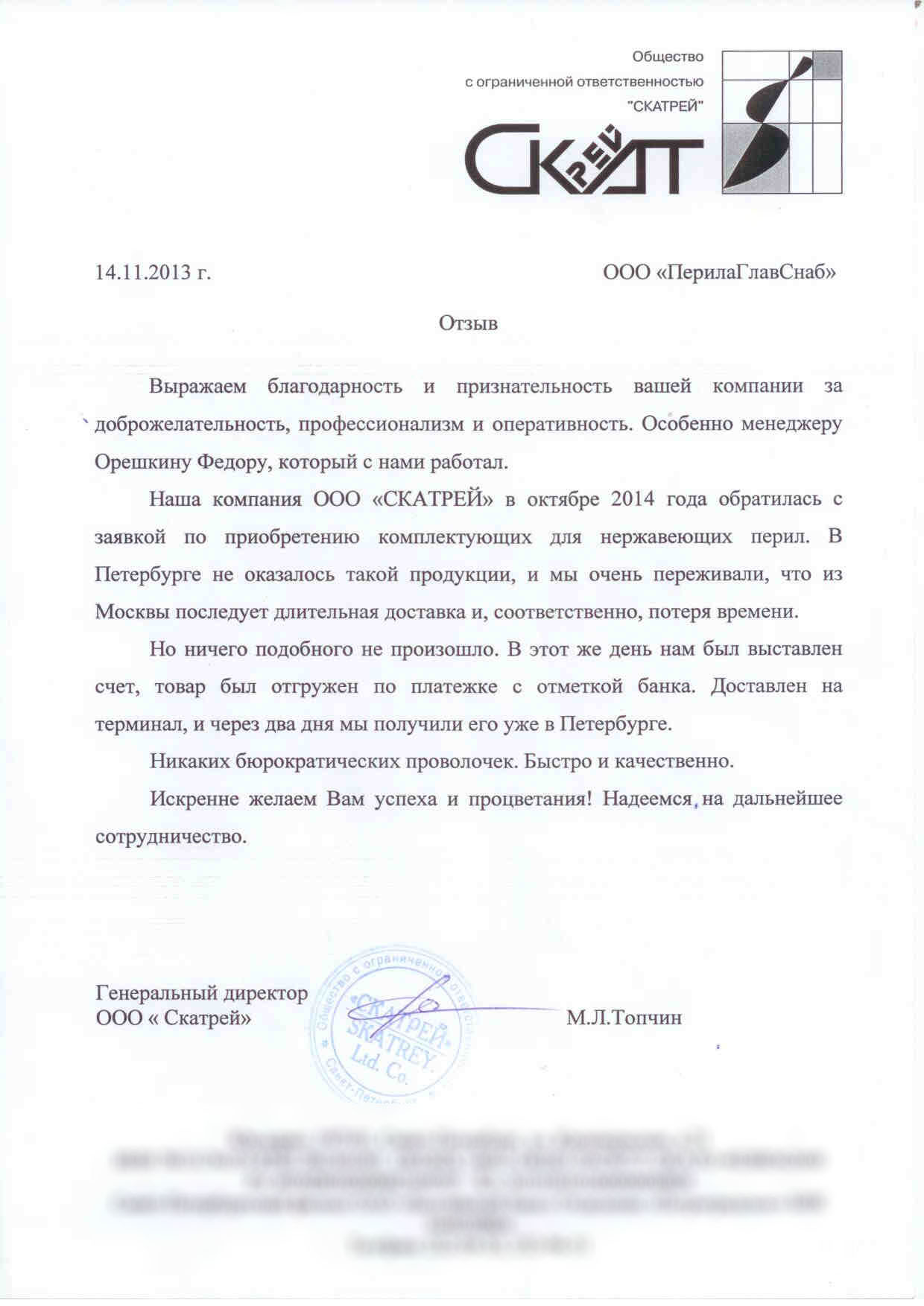 Наша компания ООО «СКАТРЕЙ» в октябре 2014 года обратилась с заявкой по приобретению комплектующих для нержавеющих перил. В Петербурге не оказалось такой продукции, и мы очень переживали, что из Москвы последует длительная доставка и, соответственно, потеря времени.