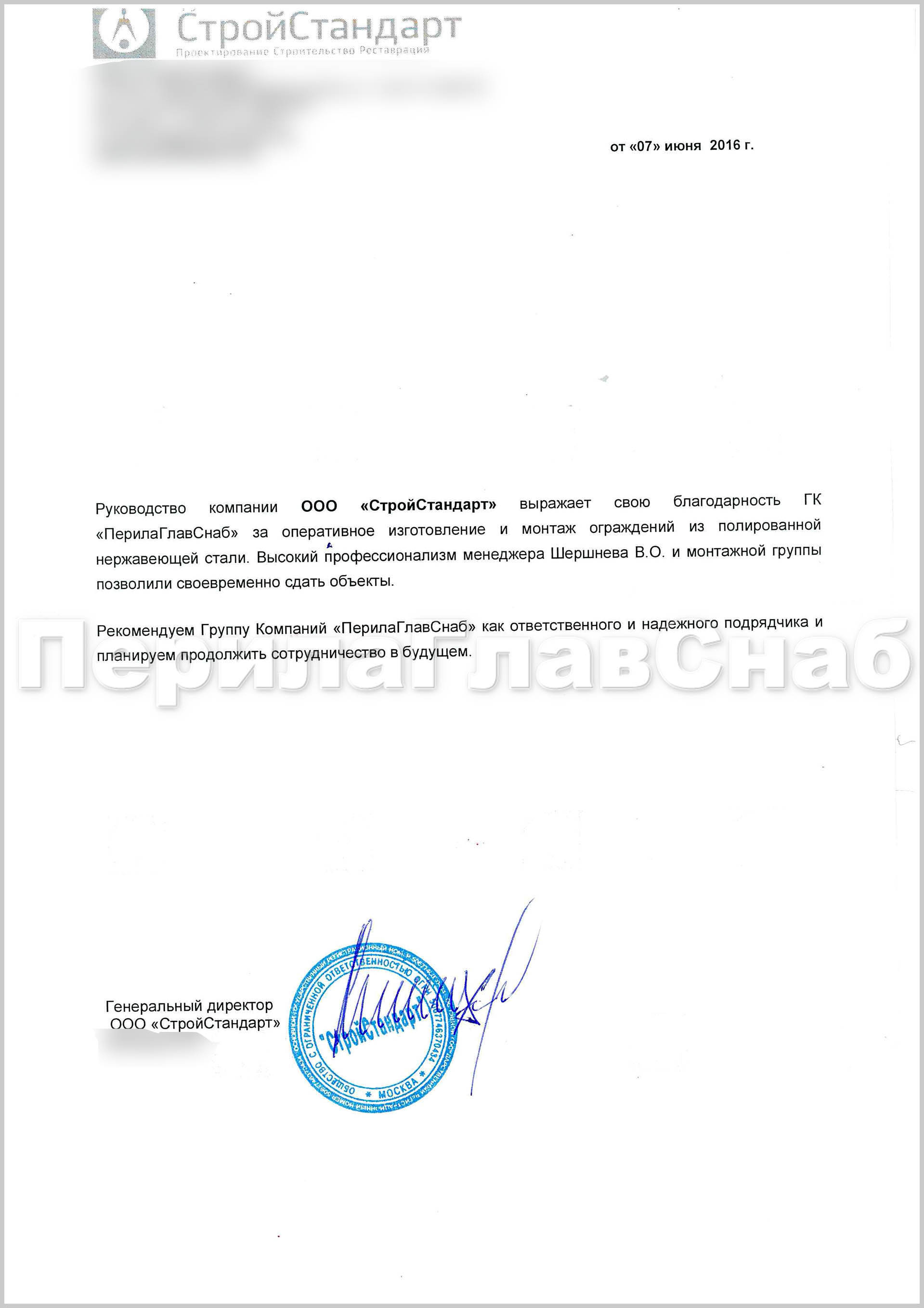 Руководство компании ООО "СтройСтандарт" выражает свою благодарность ГК "ПерилаГлавСнаб" за оперативное изготовление и монтаж ограждений из полированной нержавеющей стали. Высокий профессионализм менеджера Шершнева В. О. и монтажной группы позволил своевременно сдать объекты.