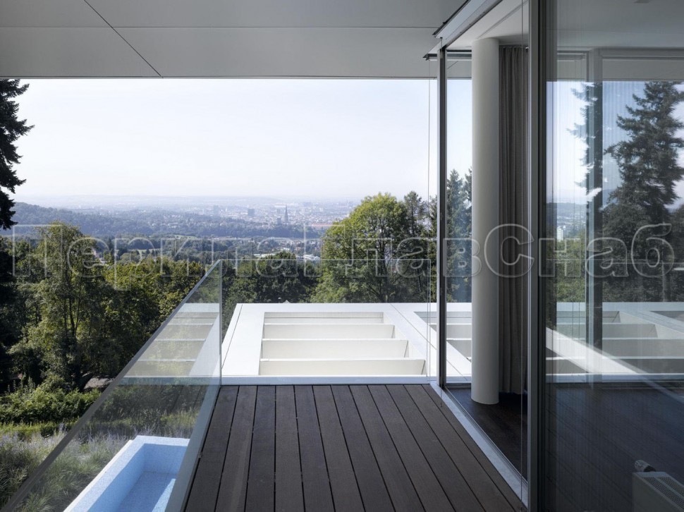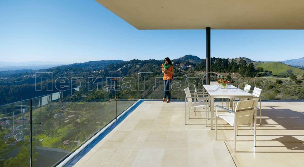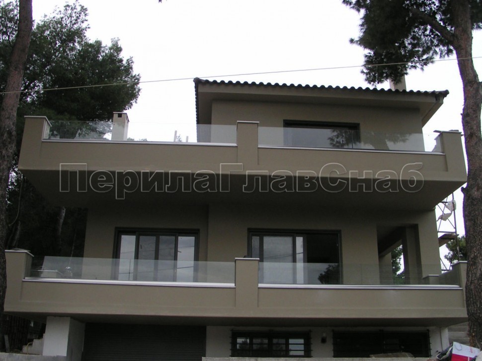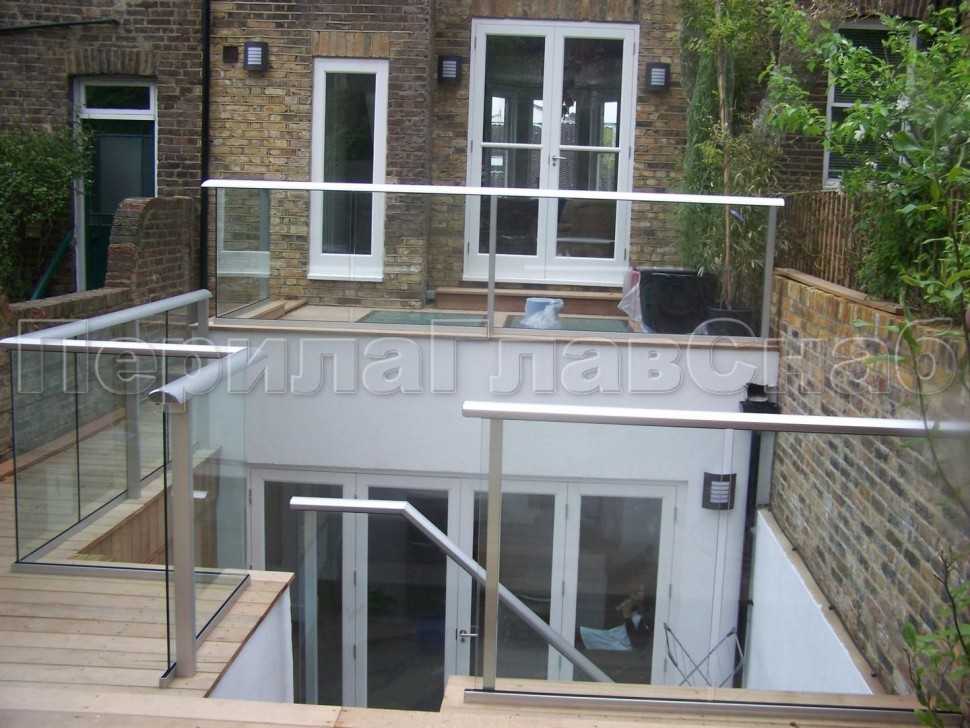 Несущее стекло крепится на алюминиевый профиль. Профиль изготовлен из полированного (зеркального) анодированного алюминия. Крепления профиля к плите основания осуществляется в торец. В целом, конструкция таких перил очень надежная.